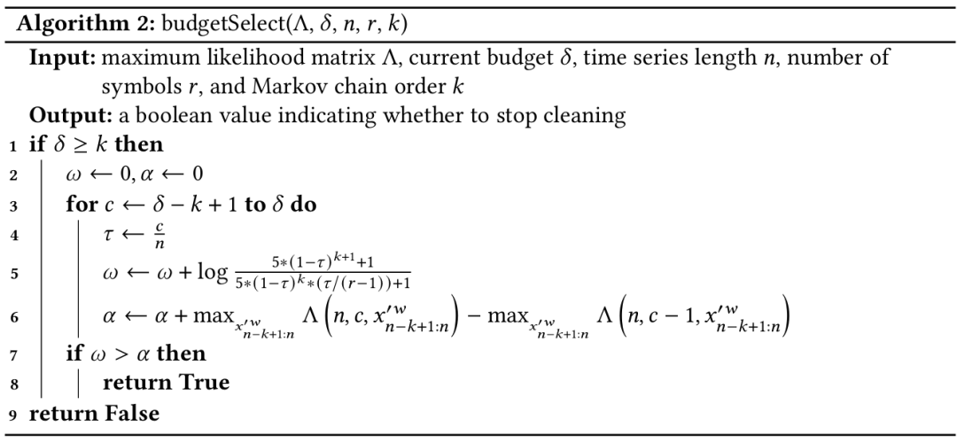 自动预算选择的伪代码如算法2所示,在逐步增加预算的过程中,若实际增长率接近并持续匹配理论下限,就停止清洗过程并输出最终结果。