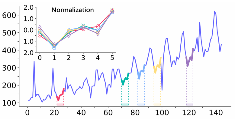经历前三阶段,获得了一个具有最大似然和最小困惑的符号化时间序列,接下来便是将符号重建到数值的时间序列以完成清洗过程。文章设计了一个基于线性回归(LR)的策略。对于一个清洗过的数据点,首先选择它所属最频繁的模式拟合,对于时间序列中所有相同的模式,将其中与清洗数据点位置相同的数据点的值设置为模型目标,将真实数据点对应的值设置为模型输入,然后利用这些拟合LR模型并得到参数。之后便计算清洗后数据点的重建结果。如果没有合适的模式或足够的初始干净数据点用于拟合,也可以直接选择质心作为结果。如图3所示,尽管变化方式表现相似,并且可能是反复出现的模式,但由于不同的基础值使他们的值变化很大。在这种情况下,概率计算阶段会将这样的模式单独计算。这些模式被称为同态模式,对行为相似的模式属于同一个同态集合。这种情况通常导致模式稀疏,文章通过引入同态模式聚合解决该问题。