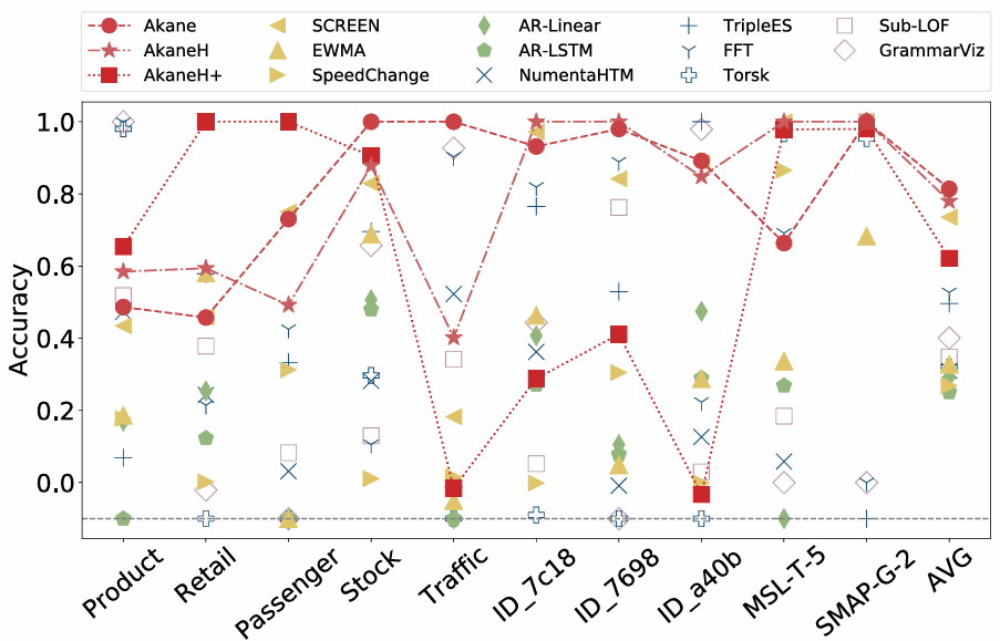 (K-Means符码化+启发式算法,无模式聚合)和AkaneH+(均匀符码化+启发式算法,有模式聚合)。实验选择12个真实数据集。11个方法为基线,包括EMWA、AR-Linear、AR-LSTM、SCREEN、SpeedChange、Torsk、NumentaHTM、TripleES、FFT、GrammarViz、Sub-LOF。以均方误差作为评价时间序列数据清理算法质量标准。