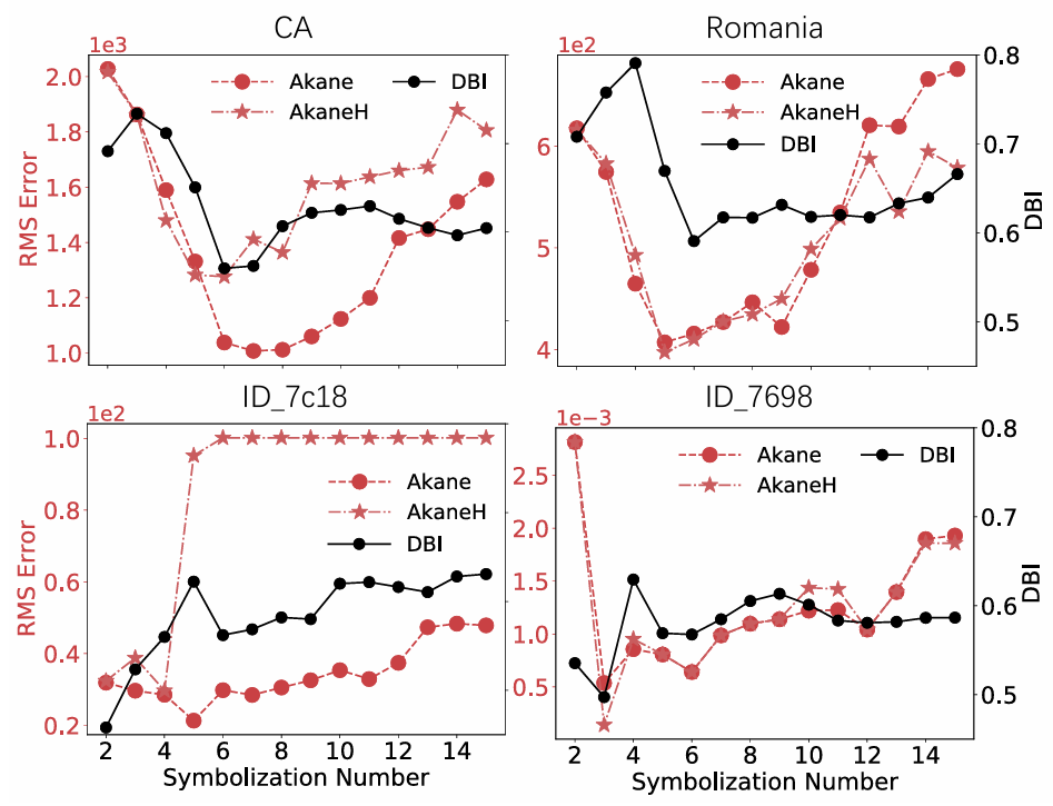 EWMA的有效性有限,而AR算法通常进行不准确的拟合,并错误地修改许多最初干净的数据点。6种基于异常检测的方法的性能也一般,FFT、TripleES和GrammarViz在其中表现出相对较强的性能,SCREEN通过利用地面真实值来识别大的峰值而表现良好。SpeedChange可以识别和纠正一些脏点,但由于其速度变化假设,可能会将它们与干净数据混淆,从而导致性能欠佳。本文的方法总体上比现有的方法表现得更好(除SCREEN)。对于Traffic, ID_7c18, ID_7698和ID_a40b数据集,AkaneH+表现不佳,因为数据中许多微小且不显著的变化使得难以捕获有意义的循环模式并选择精确的预算。对于产品、零售和客运数据集,AkaneH+优于Akane和AkaneH,因为这些数据集中存在单一趋势,证明了采用同态模式聚合来检测和解决隐蔽偏差的有效性。综合来看,Akane和AkaneH使用K-Means符号化,更适合具有特定非均匀分布特征的真实数据集。Akane优先考虑高效率,而AkaneH则利用贪婪的思想,在保留大部分功效的同时强调效率。AkaneH+使用万无一失的统一符号和同态模式聚合,适合于没有这种分布或太多先验知识的数据。文章具体评估了符号数r、马尔科夫链阶k、同态模式距离阈值对性能的影响。图5显示了使用K-Means进行符号化的算法性能,以及对应的DBI在𝑟变化时的性能。对脏CA和罗马尼亚时间序列使用𝑟= 6,对ID_7698使用𝑟= 3,对ID_7c18使用𝑟= 2,产生最小DBI,一致地为Akane和AkaneH产生几乎最佳的清洁结果,验证了文章提出的在K-Means中选择符号数𝑟的方法的有效性。