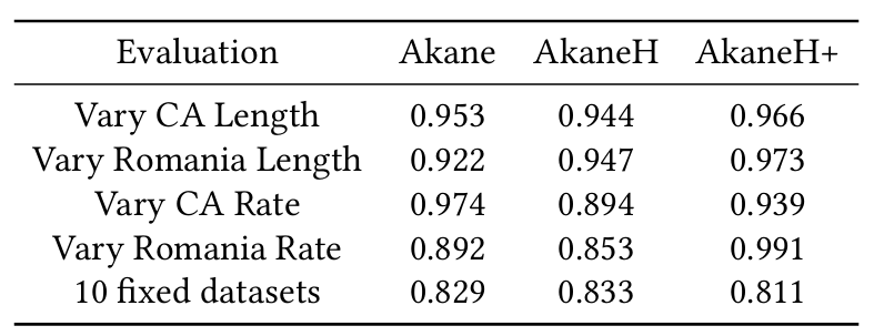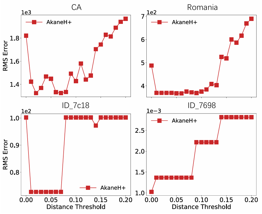 图6展示了AkaneH+的性能如何随着变化的影响而变化。当设置为0时,表示没有模式聚集,算法通常表现出较差的清洗效果,从而证实了均匀符号化下的模式稀疏性。实验表明,在0.01 ~ 0.08的范围内,AkaneH+在所有4个数据集上的表现都很好,证实了由于归一化和均方运算,最优的预测结果受数据集的影响很小。