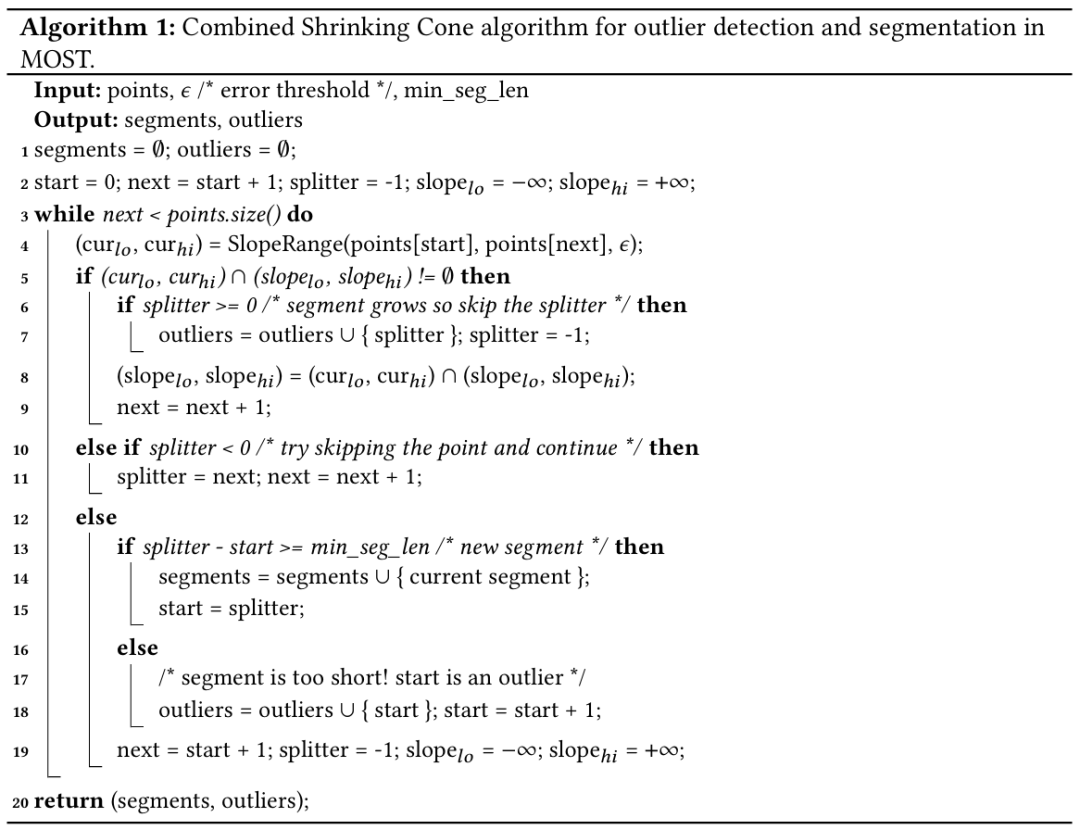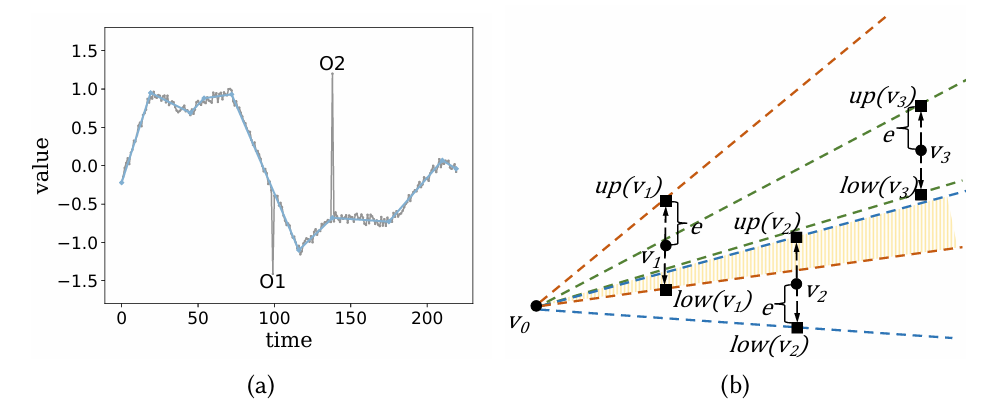 图1 (a)一个时间序列的分段和异常情况;(b)收缩锥的分割过程异常值。作者构造线性模型来压缩数据,如果预测值的误差超过误差界限的数据点称为异常点。作者总结了现有的异常值检测方法:(1)基于密度检测:在滑动窗口中检查每个点,计算其邻居(即值接近的点)的数量。如果某个点在任何窗口中都没有足够的邻居,则该点被视为异常值。(2)基于直方图的异常值检测:基于最优直方图(vopt),给定固定数量的桶。如果移除某个点能够减少直方图的估计误差,则该点被认为是异常。动态规划算法可以计算出最优的异常点集合。(3)基于模型的异常值检测:ML模型如LSTM和循环自编码器集合虽然精度高,但计算成本高,不适用于物联网场景下的快速数据摄取。收缩锥(Shrinking Cone)是一种源于可行空间窗口的方法,通过计算每个数据点的斜率范围来检测异常。当斜率范围变为空时,段的增长停止。如图1b所示,给定一个误差界𝑒,锥形的可行斜率范围随着点的增加而缩小。V0是该分段的起点。添加𝑉1后,可行的斜率范围为[𝑙𝑜𝑤(𝑉1),𝑢𝑝(𝑉1)]。添加𝑉2后,范围缩小到[𝑙𝑜𝑤(𝑉1),𝑢𝑝(𝑉2)]。如果添加了𝑉3,则∩3i=1[𝑙𝑜𝑤(𝑉𝑖),𝑢𝑝(𝑉𝑖)]=∅,则该范围变为空。因此,该段停止在𝑉2。