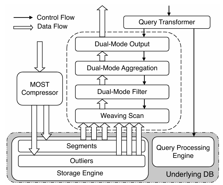 为了支持这些操作,MostDB在底层数据库中检索数据,并通过查询处理引擎进行段和异常的双模处理。查询操作符具有段模式和异常模式,通过双模式扫描、过滤、聚合和输出操作符来实现高效的查询处理。