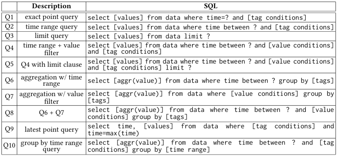 段表(Segment Table):存储段的模型参数文章要求底层数据库支持基于tags和时间范围的高效数据检索。具体而言,作者使用了InfluxDB作为底层数据库。由于InfluxDB不支持BFLOAT16格式,MOST将斜率列声明为32位浮点类型,并清除低16位尾数位。MOST利用InfluxDB默认的压缩方法(即Gorilla用于intercept和slope,Simple8b用于q)来压缩列。对于规则时间序列,不需要存储时间戳;对于不规则时间序列,MOST将时间戳作为测量值的一列进行存储,并使用自增ID作为规则时间戳。实际的时间戳列使用Delta-of-Delta编码进行压缩。MostDB的查询处理引擎支持常见的IoT查询类型,通过在底层数据库中检索数据并在查询操作符中处理段和异常,实现高效的查询处理。查询操作分析。根据IoTDB Benchmark,在物联网应用程序中有10种常见的查询类型,如表1所示。IoT应用中常见的查询类型包括:- 时间操作:查询数据在某个时间点(Q1, Q9)或时间范围(Q2, Q4-6, Q8, Q10)内的数据。MostDB在检索数据时,指定适当的时间条件。