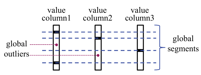 MOST压缩算法由三个步骤组成:1)异常检测,2)分段,3)模型和异常编码。需要注意的是,在分段之前进行异常检测非常重要。图1a展示了一个时间序列的分段和异常情况。在分段之前进行异常检测,可以防止平滑段被零散的异常点分割。