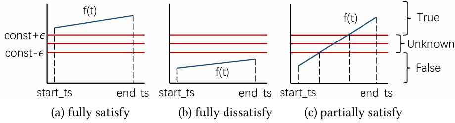 在段模式下,扫描操作符处理每个段的线性模型。操作符将整个段作为一个整体进行处理。例如,在过滤操作中,段模式可以根据段的线性模型快速决定是否接受或拒绝整个段,或者接受段的一部分。在异常模式下,扫描操作符逐个处理异常记录,类似于传统的关系数据库操作符。这种模式逐个读取和处理异常值,以确保所有数据点,包括异常点,都能被准确处理和查询。对于每个段,在评估过滤谓词时考虑三种情况。图 5 展示了一个示例,其中过滤条件为 value > const。在情况 (a) 中,段完全满足过滤条件,则将结果设置为真。在情况 (b) 中,段完全不满足过滤条件,则将结果设置为假。在情况 (c) 中,段部分满足过滤条件,因此将段划分为最多三个较小的段,如图 5(c) 所示。MOST相应地设置真和假的部分结果。对于未知部分,则需要考虑每个点。这里简单地将未知部分的所有点插入异常值列表,并与其他异常值一起处理。未知段变为空段,其结果设置为假。对于每个异常值,生成一个概率 p 用于过滤评估。首先根据预测值和误差边界约束计算 [valuelo, valuehi]。然后将值范围与过滤谓词进行比较,也有三种情况。首先,整个范围满足过滤条件,将p设置为1。其次,整个范围不满足过滤条件,则将p设置为0。第三,范围与过滤条件相交,根据均匀分布计算 p。对于示例过滤条件 value > const,如果 const 在[valuelo, valuehi]范围内,则p= (valuehi - const) (valuehi- valuelo)。逻辑操作(即 AND, OR, NOT)的过滤谓词可以轻松支持。请回忆,所有值列的段在编织扫描时已对齐。如果在任何过滤评估中发生情况 (c),则意味着可以进一步将段划分为更小的段。在给定段上评估单个过滤器后得到真/假结果。因此,对于一个段来说,计算 AND/OR/NOT 过滤谓词是很容易的。对于异常值,MOST假设不同列上的过滤结果是独立的。假设两个过滤谓词的概率分别为 p(pred1) = p1和p(pred2) = p2。则 p(pred1 ANDpred2) = p1 * p2,p(pred1 OR pred2) = 1 - (1 - p1)(1 - p2),p(NOT pred1) = 1-p1。过滤操作符通常输出所有输入段和异常值,并增强每个段的真/假结果和每个异常值的概率。只有当段的结果为假,并且它没有任何异常值或所有相关异常值的概率为 0 时,段才可以安全地丢弃。只有当异常值的概率为0并且其关联段的结果为假时,异常值才可以丢弃。