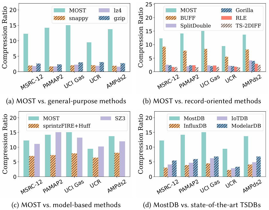 对比方法:MOST 与最先进的压缩技术进行比较,具体包括通用方法(如 Snappy、LZ4、Gzip)、记录导向方法(如 BUFF、SplitDouble、Gorilla、RLE、TS-2DIFF)、模型导向方法(如 sprintzFIRE+Huff、SZ3)以及最先进的时间序列数据库(如 InfluxDB、IoTDB、ModelarDB)