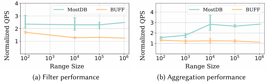 压缩率对比:图 6 显示了 MOST 与最先进的压缩技术的压缩率对比。压缩率计算为压缩前的大小除以压缩后的大小,因此值越高越好。图6(a)和6(b)显示,MOST 相较于通用和记录导向的无损压缩方法,取得了3.13到9.03倍的改善。相较于 BUFF,MOST 的压缩率提升了1.32到1.83倍。图6(c)显示,MOST 与最先进的基于模型的压缩技术(如 sprintzFIRE+Huff 和 SZ3)的比较结果。MOST 相较于 sprintzFIRE+Huff 的压缩率提升了1.48到1.94倍与最先进的时间序列数据库的比较:图6(d)显示了MostDB与InfluxDB、IoTDB和ModelarDB的比较结果。MostDB相较于InfluxDB、IoTDB和ModelarDB分别实现了2.36到4.24倍、2.42到3.37倍和2.02到2.84倍的压缩率提升。这表明 MOST 能够有效地提高时间序列数据库的压缩率。过滤查询性能:作者比较了 MostDB、SZ3 和 BUFF 的查询性能。由于没有时间序列数据库支持SZ3,文章在内存中完全运行查询。图7(a)显示了过滤查询的性能(TQ2),图 13b 报告了聚合查询的性能(不带 group by 的 TQ3)。从图中可以看出,MOST 的查询性能显著优于 SZ3,这是因为 SZ3 在计算之前需要解压缩数据块。BUFF 通过 SIMD 实现了良好的过滤查询性能,但在处理满足值谓词的分散记录子集的聚合时效率较低。相比之下,MostDB 的双模式处理能够以低成本处理数据段,从而实现更好的性能。