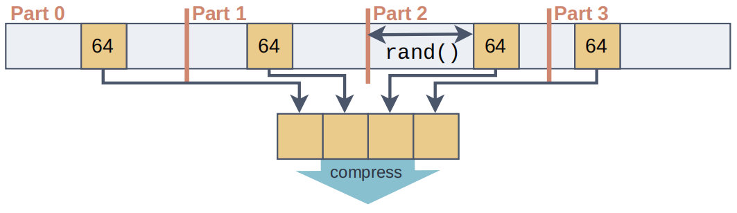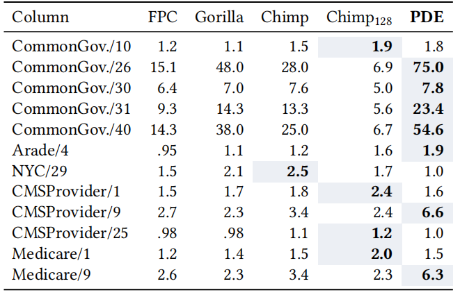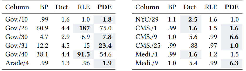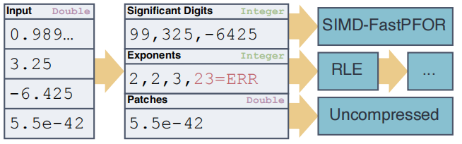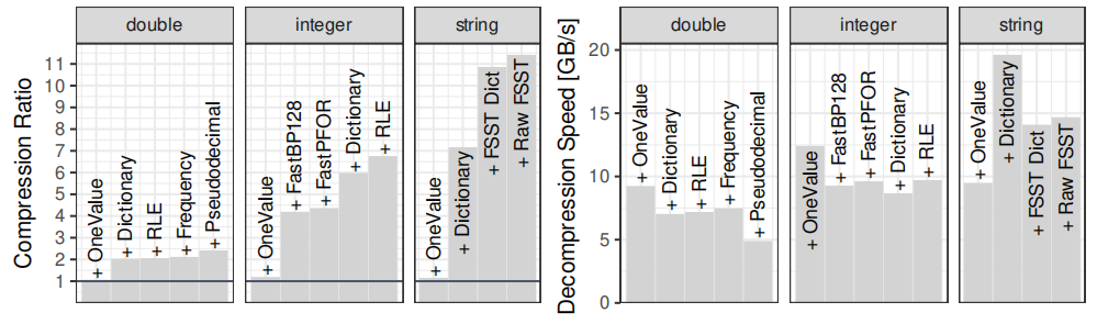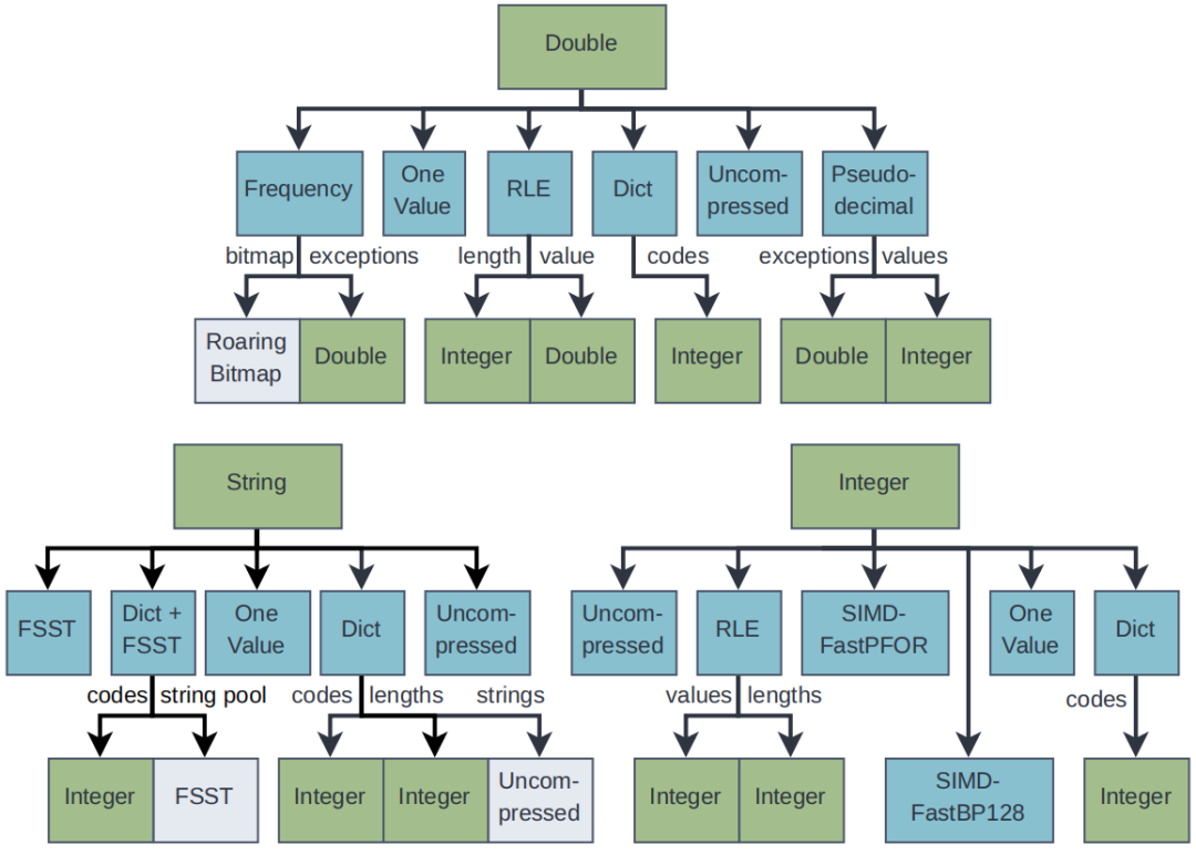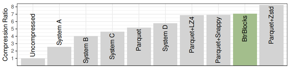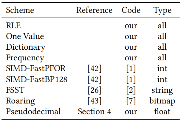 数据仓库正逐渐迁移到云端。许多组织正在收集和分析日益庞大的数据集,这些数据越来越多地存储在像亚马逊AWS、微软Azure和谷歌云这样的公共云中。为了分析这些数据集,客户使用云端数据仓库系统。其中数据存储在分布式云对象存储中,如S3,并且计算能力可以根据需要弹性生成。但是数据仓库可能成为数据陷阱。经过长时间的验证,数据仓库依赖压缩的列式存储。默认情况下,大多数系统使用专有的存储格式,其中一个显著缺点是,数据被困在一个系统或者生态中,不能被其他系统灵活地使用。因此提出采用数据湖的方式来解决数据仓库的问题。数据湖有着开放的存储结构,但存在以下问题:1)过去网速慢导致访问数据湖慢,现已解决;2)与专有的数据仓库相比欠有效、紧凑,需要进行压缩。BtrBlocks的设计目的是通过低存储成本和快速解压缩,将总体工作负载成本最小化。为了在真实数据上实现有效的压缩,文章结合了7种现有的编码方案和一种新颖的编码方案,提供快速解压缩性能,并可以级联使用(例如先RLE然后按位打包)。BtrBlocks还设计了一种算法用于确定对特定数据块使用哪种编码。 Parquet & ORC:Apache Parquet 和 Apache ORC是开源的面向列的格式,支持了很多分析系统,其中Parquet使用更加广泛。Parquet列编码:采用定长编码,支持RLE编码、字典、位打包,Delta编码。使用的编码方式可以由用户指定也可以由满足特定情况的规则确定。Parquet将结果打包成行组。多个行组被组合成一个Parquet文件,每个行组的元数据同样存在文件中。元数据和统计信息:每一个Parquet文件里面都包括元数据和统计数据以及一些轻量级索引,这些信息对查询处理十分重要,但是这些信息放在数据文件里是不太合适的。本文将数据和其他的信息分离开来,仅生成具有可配置大小的压缩数据块。元数据、统计信息和索引是完全独立的。额外的通用压缩。Parquet中可以选择的编码方案很少,因此在使用简单的列编码方案后实际压缩率并不高,因此会使用Snappy、Brotli、Gzip、Zstd、LZ4、LZO和BZip2等算法进行二次压缩,但是解压时间就会相应增加。一个更好的压缩方法。上面提到的压缩方案的解压时间很长,因此BtrBlocks扩展了Parquet提供的轻量级编码选择并且改进了编码方案选择算法。 BtrBlocks的理念是结合多种类型特定的高效编码方案,涵盖不同的数据分布,从而在保持解压缩速度的同时实现高压缩比。表1列出了BtrBlocks中使用的编码方案。BtrBlocks对类型化数据列(整数、双精度浮点数和可变长度字符串)进行压缩。BtrBlocks将每一列分成固定大小的块, 默认大小为64,000个条目。逐个压缩块使得BtrBlocks能够通过根据每个块中的数据调整压缩方案来应对不断变化的数据分布。块还有助于并行化压缩和解压缩过程。RLE & One Value。Run-length Encoding (RLE)是一种普遍的技术,它对相等值的连续序列进行压缩。例如,连续的序列{42, 42, 42},存储为(42, 3)。One Value是针对只有一个唯一值的列进行特殊优化。Dictionary。字典编码是另一种简单但有效的方案,它使用(较短的)编码替换输入中的不同值。一个查找结构(即字典)将每个编码映射到原始的不同值。用于实现字典的数据结构由编码类型确定,字典通常是压缩字符串的唯一方式。Frequency。在真实世界的数据集中,通常会有一些多次出现的值,形成了偏斜分布。DB2 BLU提出了一种基于数据频率的频率编码,使用多个代码长度。例如,一个一位编码可以表示两个最频繁的值,一个三位代码可以表示接下来的八个最频繁的值,依此类推。通常,一列只有一个主导的频繁值,其次频繁的值出现的频率呈指数下降。本文针对这种情况进行了优化,只存储:1)最频繁的值,2)标记哪些值是最频繁值的位图,3)不是最顶部值的异常值。 FOR & Bit-packing。对于整数,参考框架(Frame of Reference,FOR)将每个值编码为相对于选定基值的增量。例如,序列{105, 101, 113},我们可以选择基值为100,然后存储{5, 1, 13}。这在与Bit-packing结合使用时很有用,后者截断不必要的前导位,可以使用4位而不是8位对每个值进行Bit-packing。但是,基本的FOR方案在处理离群值时效果不佳。例如,向示例序列添加118,这种情况下每一个值都需要5位来表示。因此,Patched FOR (PFOR)将这些离群值存储为异常,并保留其余值的较小位宽。SIMD-FastPFOR和SIMD-FastBP128构建在这个想法上,并专门为SIMD(单指令多数据)优化了算法和布局。在BtrBlocks中使用这些现有的高性能实现。FSST。Fast Static Symbol Table (FSST)是一种用于字符串的轻量级压缩方案,因为真实世界中大部分的数据都以字符串形式存储。FSST通过将长度最多为8个字节的频繁出现的子字符串替换为1个字节的编码来实现压缩。这些编码在一个固定大小的255条目字典(符号表)中进行跟踪。符号表是不可变的,并且用于整个字符串块。解压缩是简单且快速的但是压缩时需要找到一个合适的符号表,所以较为复杂。NULL Storage Using Roaring Bitmaps。BtrBlocks使用Roaring Bitmap存储每列的NULL值。Roaring 的背后思想是根据位的局部密度使用不同的数据结构,这使得它对于许多数据分布非常高效。BtrBlocks使用一个针对现代硬件进行了优化的开源C++库来实现Roaring Bitmaps。除了追踪NULL值之外,BtrBlocks还使用Roaring Bitmaps来追踪内部编码方案(例如频率编码)的异常情况。 方案选择算法。针对不同数据类型本文提供了不同的编码方案,