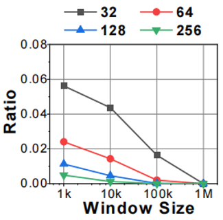 数据流处理在数据科学的各个领域都非常重要,如入侵检测、推荐系统等。数据流通常是高度倾斜的,也就是说,一些数据项是非常受欢迎的(称为频繁项),而绝大多数数据项是不受欢迎的(称为非频繁项)。许多重要的任务都关注于频繁项,比如寻找出现频率最高的k个数据项(top k问题)。在这些任务中,大量非频繁项消耗了太多的内存,从而降低了准确性。Sketch作为一种误差小的紧凑数据结构,在数据流处理中具有广阔的应用前景。它的速度是恒定的:每次插入都只需要进行几次哈希计算和内存访问。为了满足这些更依赖于频繁项的任务,一个被广泛认可的方法是利用Sketch来过滤掉非频繁项。理想情况下,我们会想要过滤掉所有非频繁项。然而,一开始,每一条数据都是非频繁的,在足够长的时间后可能会变得频繁。数据流的大容量和高吞吐量使得在内存和时间有限的情况下保持所有数据的频率是不现实的。因此,论文的目标是在保证低内存和时间开销下,大致剔除非频繁项。过滤非频繁项的现有工作包括ColdFilter[1]和LogLogFilter[2]。Cold Filter使用一个2层CU sketch(一种经典的计数sketch)来记录每条数据的频率,并设置一个阈值来分离频繁项和非频繁项。插入项目时,ColdFilter会将其插入CU sketch中并查询其频率,查询得到的频率超过预先设定的阈值的数据项将被认为频繁项。为了扩大ColdFilter的过滤范围,LogLogFilter用LogLog结构替换CU sketch。ColdFilter维护了所有不频繁项的频率,导致了不必要的内存开销。ColdFilter还需要多次散列计算和内存访问(6次或更多),从而导致相当大的时间开销。LogLogFilter继承了ColdFilter的限制。为了降低内存和时间开销,论文设计了一种新的概率算法称为LadderFilter。根据观察,有些数据项不太可能成为频繁项,LadderFilter的关键技术就是及时丢弃掉这些数据项。论文还提出了一种基于SIMD的方法来优化LadderFilter。为了更好地说明观察结果,作者首先定义了以下术语:active, inactive, promising以及unpromising items。如果某条数据未出现在最近的时间窗口中,我们称之为inactive item,否则称之为active item。当某个active item变得inactive时,1) 如果它的频率很低(比如小于5),则它被称为unpromising item,2) 它的频率适中(比如在5-30之间),则它被称为promising item。论文研究了多个真实数据集,发现当某一项长期保持unpromising时,它基本上很难成为频繁项。图 1是一个真实IP跟踪数据集的实验结果,可以看出,假如我们认为一个频率小于5的inactive item是unpromising item。当频繁项目的阈值为256,滑动窗口大小为10k(绿色折线)时,只有0.1%的unpromising item成为频繁项。当滑动窗口大小超过100k时,该数字将减小到0。