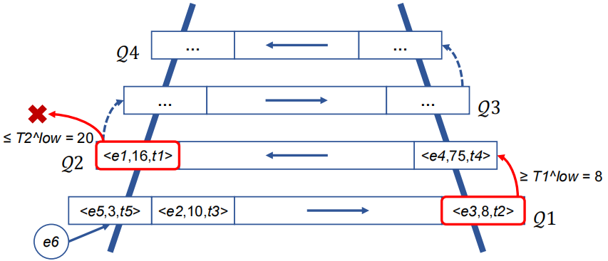 基于以上观察,论文设计了LadderFilter,其关键技术是尽早丢弃LadderFilter中的unpromising item。LadderFilter的数据结构类似于由多个LRU队列组成的阶梯(见图 2)。对于队列i,它有一个低阈值Tilow当一个公共的高阈值Thigh。当某条数据项的频率高于Thigh时,它被视为频繁项,移出队列。当其频率小于Tilow时,被视为unpromising item,否则视为promising item。频繁项被发送到专门的Sketch记录下来,unpromising item被简单地丢弃。Promising item将被插入到上层队列,这样一来,promising item有了新的一次机会成为频繁项。如果该项在上层队列中增长得快并超过Thigh,它将成为一个频繁项;如果它增长得太慢(小于Tlow i+1),它将被认为是一个unpromising