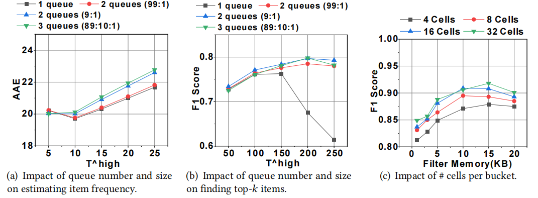 论文介绍了如何在数据流处理中的四个重要任务中部署LadderFilter。这里我们简单介绍如何用LadderrFilter进行频率的估计。问题定义:给定数据流,返回每个ID对应的数据项的频率。现有方案:CU sketch[3],用于估计频率。一个CU sketch由d个计数器数组组成,并且每个数组都与一个哈希函数关联。当插入数据项e时,CU sketch首先计算d个哈希函数来定位到每个计数器数组中的对应位置。然后,CU sketch将其中最小的计数器增加1,这称为保守更新策略。当查询e的频率时,CU sketch同样通过d个哈希函数定位到对应的位置,然后将映射到的计数器之间的最小值报告为e的频率。应用LadderFilter:可以建立一个LadderFilter来配合CU sketch。LadderFilter将被用来防止非频繁项被插入到CU sketch中,因为作者认为频繁项的准确性更重要。插入:插入数据项e时,首先插入LadderFilter。如果LadderFilter将e视为一个频繁项,再进一步将其插入到CU sketch中。插入CU sketch的频率取决于e是否是第一次被LadderFilter视为频繁项。如果是第一次,以插入频率Thigh存到CU sketch;否则,以插入频率1发送至CU sketch。查询:查询包含两个步骤。1) 首先查询CU sketch中e的频率。如果其频率不是0,则必须超过阈值Thigh,因为只有频繁项被插入到CU sketch中,2)否则,e是一个非频繁项。然后我们检查e是否在LadderFilter中。如果它被记录在LadderFilter中,返回LadderFilter中对应的频率,否则返回0。实验平台:一台CPU服务器(Intel i9-10980XE)。CPU有三级缓存:64KB L1缓存,1MB L2缓存,24.75MB L3缓存。CPU频率为4.2GHZ,内存频率为3200MHZ。数据集:论文一共使用了3个数据集进行评估,1)IP跟踪数据集:IP跟踪数据集是收集的匿名IP跟踪流。srcIP作为ID。该数据集包含2700万条数据,共有25万条不同的数据。2)WebDocs数据集:WebDocs数据集是一个由web文档集合构建的事务性数据集。该数据集包含3200万条数据,共有95万条不同的数据。3)合成数据集:这两个合成数据集按照Zipf分布生成。两个数据集的偏度分别为0.5和1.0。每个数据集包含3200万条数据,共有100万条不同的数据。评价指标:论文主要包含3个评价指标,1) AAE,平均绝对误差,越低越好;2) F1 score,越高越好,3) 吞吐量(每秒百万操作次数),越高越好。队列数量和大小的影响(图 5(a)-(b)):可以发现,当使用多个队列来寻找top k时,准确性对不同的参数设置并不敏感。如图5(b)所示,在接近最优阈值(50)下,单队列和多队列都获得了较高的准确度;而在其他阈值下(>150)下,使用多个队列的准确性明显高于使用单个队列。如图5(a)所示,在估算数据频率时,趋势正好相反。每个桶的格子数量的影响(图 5(c)):可以发现,当每个桶的格子数超过8时,精度基本上停止增加。每个桶8个格子的F1 score平均比每个桶更多的格子仅低1.35%。