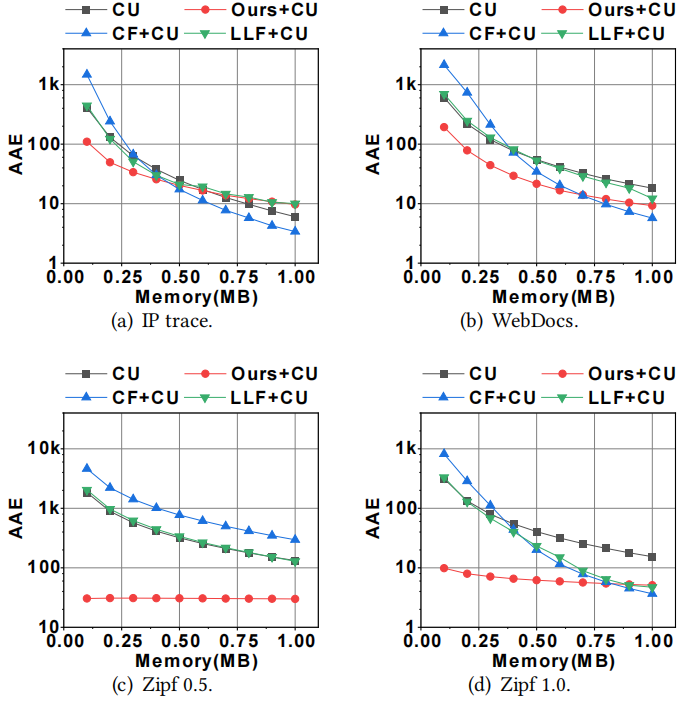 准确性(图 6):可以认为LadderFilter将CU sketch的误差减少了多达28.8倍。如图 6所示,LadderFilter的AAE平均分别比CU、CU+CF、CF和CU+LLF低7.43倍、15.2倍和7.29倍。并且LadderFilter在有限的内存下达到了很高的精度。例如,当内存为100KB时,LadderFilter的AAE平均比对比算法分别低7.08、5.95、93.0和49.5倍。原因是LadderFilter丢弃了不常见的数据项,而CF和LLF保留了所有不常见的数据项。因此,LadderFilter消耗更少的内存,并可以更有效地使用内存。吞吐量(图 7):与CF和LLF相比,LadderFilter实现了更高的吞吐量。如图 7所示,LadderFilter的吞吐量分别是CU+CF和CU+LLF的1.17和1.09倍。