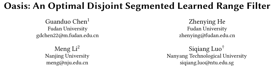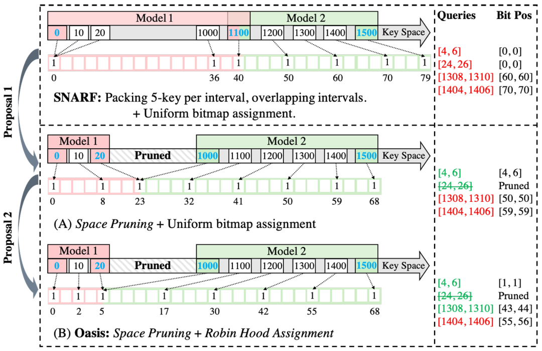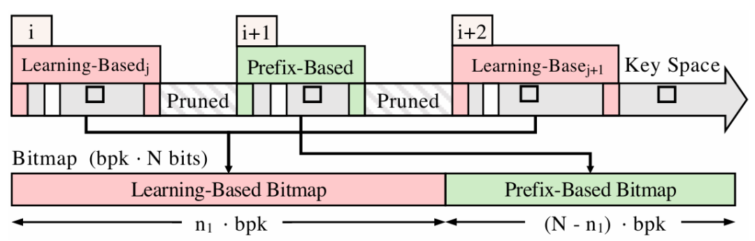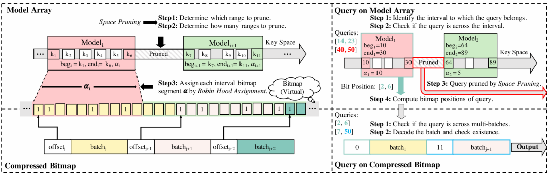 学习增强型数据结构推动了范围过滤器的发展,使其相较于传统的非学习型范围过滤器,显著降低了误判率(FPR)。其核心思想是采用分段线性函数,将整个键空间均匀地映射到位图上。然而,这种均匀映射导致空间利用率低下,从而影响FPR。那么如何在空间占用和FPR之间达到更好的权衡呢?本次为大家带来数据库领域顶级会议VLDB的论文:《Oasis: An Optimal Disjoint Segmented Learned Range Filter》范围过滤器的重要性:范围查询是数据库中的基本操作,它从键集D中检索位于指定查询范围l, r内的所有记录。范围查询有着广泛的应用场景,例如时间序列数据中的相似性搜索和异常检测。然而,范围查询也是I/O开销非常高的操作,通常需要扫描整个数据集以识别所有符合条件的记录。为了解决这个问题,学者们提出了范围过滤器,其可以快速判断在给定查询范围内是否有记录。范围过滤器可能会有假阳性,但可以保证没有假阴性。一旦范围过滤器确认在范围内不存在记录,整个范围查询就可以立即安全地终止,而无需访问磁盘。这样提前终止操作避免了不必要的数据扫描,大大提高了查询效率。现有范围过滤器:最先进的范围过滤器可以分为两类:基于前缀的范围过滤器和基于学习的范围过滤器。其中SNARF为首个基于学习的范围过滤器,相比最先进的基于前缀的过滤器,它将误判率(FPR)降低了一个数量级以上。SNARF的基本思想是基于学习的范围编码:(1)将整个键空间划分为多个相邻的区间,每个区间包含相同数量的键;(2)为每个区间分配一个固定长度的位图;(3)为每个区间训练一个线性函数,将区间内的每个键映射到对应位图中的一个特定位,并将该位设置为1。这种方法将两个相邻键之间的空范围映射到位图段中一系列连续的零位。在范围查询过程中,查询的左/右边界被映射到位图中的某个位,接着检查这两个映射位之间是否存在任何非零位。然而,在处理大范围查询时,SNARF的空间利用率十分低下。如图1所示,SNARF将整个键空间划分成了[0, 1100]以及[1100, 1500]两个区间,并为每个区间均匀分配了一个40位的位图以及一个用于将区间内的键映射到对应位图位置中的学习模型。在这个例子中,SNARF将大范围的空区间(20, 1000)编码为一个35位的位图,从第1位到第35位,占用了将近一半的空间预算。因此,在内存预算固定的情况下,其他相对较小的空区间只能分配较短的位图。当查询落在这些小范围内时,将会带来很高的FPR。因此,论文提出了以下三个改进点: 1)记录代替编码:为了避免大范围空区间造成过多的内存消耗,论文提出直接记录区间边界,而不是将整个区间编码为长位图段。例如,在图1中,SNARF分配了过多的位来编码从20到1000的空区间。而论文通过明确记录这些空区间的边界(称为空间修剪策略),避免对它们进行编码。如图1(A)所示,键空间被分割为两个不相交的区间:[0, 20]和[1000, 1500]。此时,范围查询[4, 6]被映射到第4至第6个位,它们全为零,因此返回空。查询[24, 26]因为落在被修剪的区间内,因此返回空。然而,记录边界可能会引入额外的空间开销,因此如何在编码和记录之间平衡以获得理想的查询性能,是一个需要面对的挑战。2)位图分配策略:在修剪掉那些大范围空区间后,剩余的键空间将被划分为多个不相交的区间,这引发了另一个问题:如何为每个区间的位图分配内存预算。一个简单的方法是按照每个区间内键的数量成比例地分配位图位数。然而,当不同区间的长度差异显著时,这种策略可能不够理想。例如,在图1(A)中,第一个小区间[0, 20]包含三个键,而第二个大25倍的区间[1000, 1500]则只有六个键。因此,第二个区间中的每个位需要覆盖比第一个区间大的多的空间,导致位的利用不平衡。为了解决这个问题,论文引入了一个名为BsR的度量指标,以及一种优化整体BsR的方法。BsR表示在一个区间内每个位所覆盖的平均范围长度,计算方法是区间长度除以其位图中的位数。较低的BsR意味着更好的查询性能(即更低的FPR)。为了实现全局最优的查询性能,论文提出了一种位图分配方法,称为罗宾汉分配法,它从BsR较低的区间中“抢”位分配给BsR较高的区间。例如,在图1(B)中,通过从第一个区间重新分配位给第二个区间,可以准确回答前三个查询。为了实现理想的性能,挑战在于如何通过罗宾汉分配方法在区间之间实现最佳的位图分配。3)结合基于学习的方法和基于前缀的方法。论文注意到目前缺乏对这两类方法在各种键分布下性能的全面比较。为填补这一空白,论文开发了一个分析框架,能够估算给定键分布下两种编码方法的假阳性率(FPR)。初步发现表明,基于学习的方法更适合密集的键分布,而基于前缀的方法更适合稀疏的键分布。稀疏分布意味着在固定长度的范围内键的数量较少,而密集分布则意味着在相同范围内键的数量较多。如图 1(B) 所示,第一个区间[0, 20]为密集分布,而第二个区间[1000, 1500]为稀疏分布。在此基础上,论文提出将基于前缀的方法和基于学习的方法结合,以实现更强的查询性能。挑战在于如何为每个区间选择合适的编码方法。Oasis:基于上述优化,论文提出了Oasis(Optimal Disjoint Segmented Learned Range Filter),这是一种新颖的学习型范围过滤器,其结合了空间修剪和罗宾汉分配法。Oasis+:Oasis+提供了一种全新的视角,通过结合前缀编码和基于学习的编码来提升查询性能。Oasis+采用了一种两层嵌