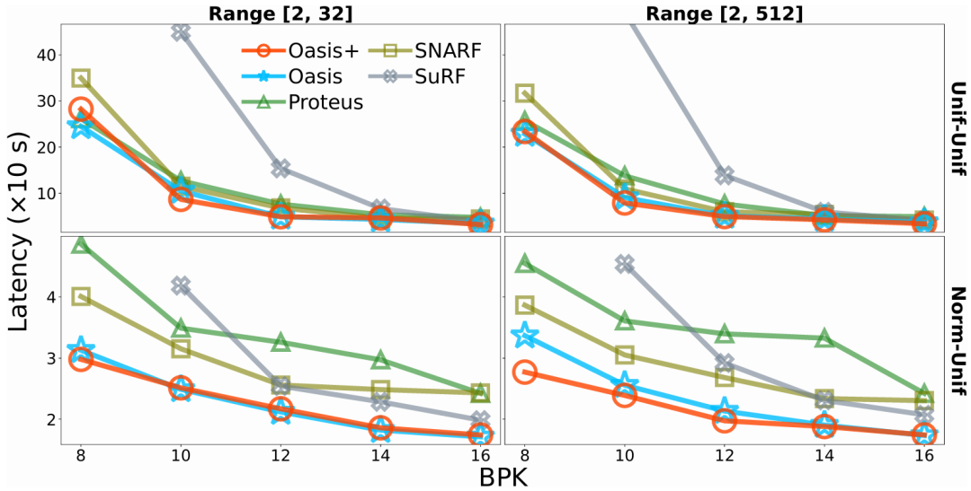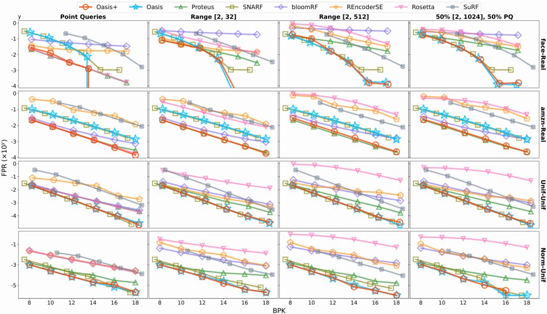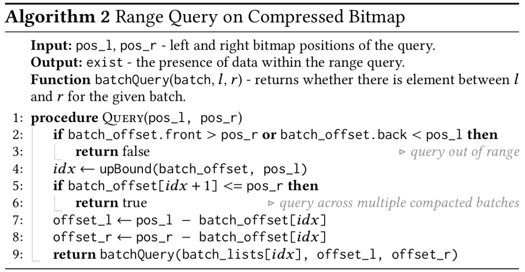 图2 Oasis框架模型数组:Oasis首先将键空间划分为不相交的区间,每个区间都有一个独特的线性模型,将键投影到相应的位图段。如公式1所示,每个模型model𝑖将给定的键𝑢映射到对应位图段的一个位上。该位相对于位图起点的偏移量,即model𝑖(𝑢),由三个参数决定:比例大小𝛼𝑖以及区间边界beg𝑖和end𝑖。其中,model𝑖(𝑢)=𝛼𝑖*(𝑢–beg𝑖)/(end𝑖–beg𝑖)。模型数组根据区间的左边界按升序排列所有模型,从而在查询过程中便于定位模型。 压缩位图:受SNARF的启发,Oasis将位图中的𝛽个连续1的位置组织为批次,并使用Elias-Fano编码技术压缩每个批次。Oasis使用了一个名为batch_list的数组存储这些压缩批次。数组batch_offset来记录每个批次相对于位图起点的偏移量。batch_offset中的第𝑖个元素表示第𝑖个批次的第一个位的位置。由于每个批次中的键数量是固定的,并且其范围信息可以从batch_offset中获取,因此无需记录每个批次的元数据。因此,这种分块压缩方法的内存开销是可以接受的。首先分别介绍查询处理过程中Oasis每个组件的操作。随后介绍Oasis的整体范围查询过程。查询模型数组:模型数组的查询过程包含四个步骤,如图2的右上角所示。1)通过区间边界找到查询所属的区间;2)检查查询是否跨越了多个区间或落在被修剪的区间内;3)将落在被修建的区间内的查询剪枝;4)计算查询对应的位图位置。查询压缩位图。压缩位图的查询过程详述于算法2中。该过程首先检查查询是否超出位图的范围(第2-3行)。如果查询不在位图范围内,则立即返回False。否则,在batch_offset上使用二分查找来识别查询左边界所属的批次(第4行)。一旦确定查询左边界的批次索引,就会检查查询的右边界是否落在当前批次内(第5行)。如果结果为真,表示查询跨越多个批次,确认在查询范围内存在数据。因此,该过程直接返回True。相反,将计算两个边界的偏移量(第7-8行),然后解压与查询对应的批次,并在指定边界内检查是否有位为1。 查询Oasis:首先,Oasis使用模型数组来确定查询的左边界和右边界对应的位图位置。接着,Oasis检查模型数组的返回结果,判断是否需要进一步处理(如果跨越多个区间或者被修剪了,直接返回模型数组返回的结果)。如果需要进一步处理,则使用压缩位图来确定查询对应的范围内是否存在数据。根据分析(具体过程请参考原论文),最小化Oasis的FPR可以转换成寻找分区个数m以及每个分区对应的边界,知道这些参数后,每个区间需要分配的bit位数也可以确定。然而,朴素的暴力搜索复杂度很高。因此,作者提出搜索Oasis的近似最优配置。作者假设工作负载均匀分布,即查询的左边界在键空间中的任意位置出现的概率相等。因此,查询落在某个区间的概率与该区间的范围大小成正比。此时,在固定m的情况下,选择top-m的相邻键(即m对距离最小的相邻键),其它键作为区间的边界即可得到m个区间。Oasis+的核心思路是在稀疏区间的编码方法上,用基于前缀的编码取代了基于学习的编码方法。具体来说,Oasis+使用Oasis来编码密集区间,并使用Proteus(一种基于前缀的范围过滤器)来编码稀疏区间。如图3所示,Oasis+框架与Oasis非常相似,包含一个位图和一个模型数组,但它在以下几个方面有所不同:1)Oasis+通过将位图划分为两个相邻的部分来实现这一点,而对应的空间分配基于每种范围过滤器类型存储的键数量。2)与 Oasis类似,Oasis+将键空间划分为不相交的区间,并存储它们的左、右边界。为了识别每个区间使用的范围过滤器类型,Oasis+引入了一个额外的位图来判断该区间是学习型范围过滤器还是前缀型范围过滤器。进行范围查询时,Oasis+与Oasis相似,在查询位图之前与Oasis过程基本一致,而在查询位图时是根据区间类型判断是使用Oasis还是Proteus。与 Oasis类似,Oasis+的构建策略决定了其性能的上限。然而,与Oasis的分区策略相比,Oasis+的构建策略有一个关键区别。在Oasis中,目标是找到最佳的区间设置,而在Oasis+的构建过程中,还需要进一步寻找每个区间的最佳过滤器类型。记Oasis的FPR为FPRLRF,Proteus的FPR为FPRPro。则整体的FPR为其中,It (i)为1表示采用Oasis,为0表示采用Proteus。由于基于学习的范围编码更适合密集键分布的区间,而基于前缀的编码更适合稀疏区间。Oasis+提出了一种基于贪心策略的构建算法。首先假设所有区间都采用基于学习的方法进行编码。然后,算法从最稀疏到最密集的区间依次遍历,并尝试在每次迭代中替换编码方式以减少整体FPR。如果替换无法降低FPR,算法会恢复之前的配置。实验平台:CPU:Intel(R) Xeon(R) Gold 5215 CPU @ 2.50GHz;内存:62GB;编程语言:C++;数据集:1)Unif:从范围[0, 264−1]中均匀生成的键;2)Norm:来自均值为263,标准差为0.01×264的正态分布;3)amzn:8000万 Amazon图书流行度数据,键值范围为 [0, 263]。4)face:2 亿Facebook用户 ID,键值范围为[0, 264−1]。对比方案:5个最新的基于前缀的范围过滤器:SURF,Proteus,Rosetta,REncoder,bloomRF,以及基于学习的范围过滤器SNARF。图4显示了 Oasis 和 Oasis+ 在不同数据集和工作负载下的FPR比较。图中的每一行对应一个数据集,不同列则代表不同的工作负载类型,包括点查询、短范围查询([2, 32])、长范围查询([2, 512])、以及非常长的范围查询([2, 1024])与点查询的组合。从中可以得出:SuRF在长范围查询上表现出色,但由于后缀截断,它在短范围查询和点查询中的FPR较高。Rosetta通过将