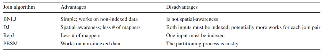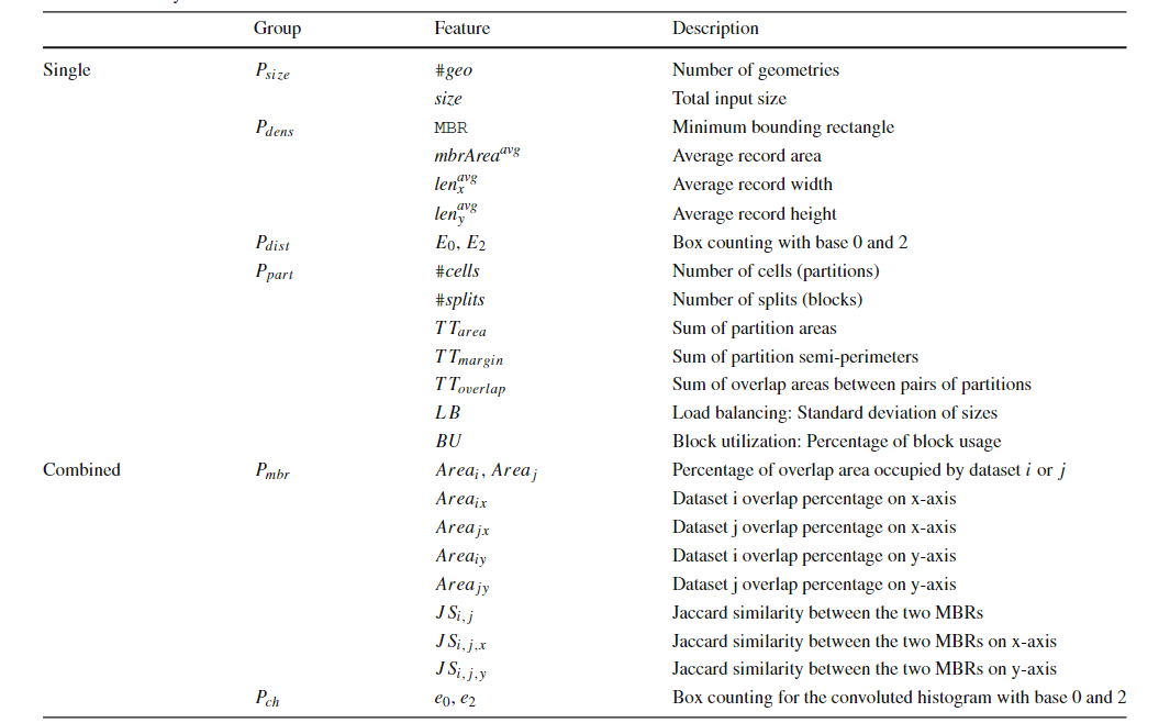 随着空间数据的快速积累,例如卫星图像、社交网络、智能手机和志愿者地理信息(VGI),传统的空间数据库管理系统(Spatial DBMS)技术难以处理这些数据量,促使出现了许多重要的空间数据管理系统,如SpatialHadoop、Hadoop-GIS等。随着空间数据的体量和复杂性的不断增长,有效的优化技术对于充分发挥空间连接的潜力和提高Apache Spark上分析工作流的整体性能至关重要。然而,选择合适的空间连接算法并非易事,这取决于多种因素,包括空间数据集的特性和不同算法的复杂性。因此,该论文提出了第一个基于机器学习的框架,用于空间连接查询优化,该框架可以适应空间数据集的特性和不同算法的复杂性。主要挑战在于如何开发可移植的成本模型,使这些模型一旦训练完成就可以应用于任何输入数据集对,因为它们能够提取重要的输入特征,例如数据分布和空间分区,空间连接算法的逻辑,以及两个输入数据集之间的关系。 文章基于四种基本空间连接算法(块嵌套循环连接(BNLJ)、基于分区的空间合并连接(PBSM)、基于分布式索引的连接(DJ)和重分区连接(RepJ))。并且用其他空间连接算法扩展模型很简单,类似于在分类模型中添加一个新类。由于算法原理不是本研究的重点,如有兴趣可阅读原文。表1 不同连接算法的优缺点