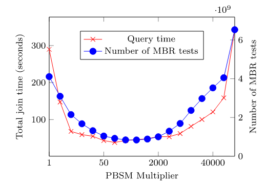 SJML框架包含多个机器学习模型,这些模型协同工作,以提高空间连接操作的性能。SJML包含5个机器学习模型(M1-M5),在开始实际的连接操作之前,SJML需提供一些关于查询性能的估计统计信息。M1估计结果大小,这是一个与算法无关的度量,可用于复杂查询的基数估计。M2根据矩形重叠测试的次数估计每个算法的计算成本。上述这些估计是在空间连接开始之前提供的。空间连接过程本身首先将数据划分为可以并行处理的较小分区。M3为给定的输入选择最有效的分区策略。对于某些分区策略,例如PBSM中使用的均匀网格分区,分区的数量也需要调优,M4用来调优该参数。最后,当涉及到并行处理分区的连接阶段时,SJML提供M5来确定处理每个单独分区的最有效顺序。在本研究中,使用平面扫描连接算法,M5决定是沿着x轴还是y轴扫描几何图形。特征提取是指将空间数据集转换为固定大小的特征向量,提取的特征包括单个数据集统计特征和组合数据集特征,其具体特征和其描述见表2,具体的计算过程可见原文。性能指标是用来评估模型或算法性能的标准。文章涉及到的性能指标有,连接选择性((σJN)用于估计连接操作的结果大小)、MBR测试选择性((σMT)用于估计每种算法的计算成本)、连接运行时间(用于衡量算法在实际执行时的效率)和最佳连接算法(用于衡量对于特定的空间连接查询,应选择哪种算法以获得最佳性能)。 文章的训练数据来源包括来自Spider数据生成器的合成数据与来自UCR-Star的公开真实数据。以表格的形式组织训练数据。训练数据的每一行都包含一个特征列表和输出度量。度量可以是连接选择性、MBR测试选择性、最佳算法或总运行时间(3.2提到的性能指标)。为了突出不同特征的影响,文章定义了四种可能的训练集,如表4所示。M1(连接选择性估计模型):建了一个随机森林回归模型,该模型将提取的特征作为输入,并预测查询的连接选择性。M2(MBR测试选择性模型): 由于每个连接算法都有特定的策略,因此MBR测试的数量是与算法相关的度量。文章建立了四个独立的模型来预测四种空间连接算法(BNLJ, PBSM, DJ, REPJ)的MBR测试选择性。每个模型都是一个随机森林回归器,以提取的特征作为输入,然后预测MBR测试的选择性。M3(算法选择模型):文章提出随机森林分类模型,该模型以特征集作为输入,从运行时间上预测最佳的空间连接算法。M4(调整模型:PBSM乘数):PBSM乘数决定了用于分区的网格(grid)的大小。通过调整PBSM乘数,可以改变每个分区中包含的数据量,从而可能影响算法的负载平衡和整体性能。图2显示总是存在一个PBSM 乘数值,对应的查询运行时间或MBR测试的数量最小。对于每个特定的连接输入,这个最优值是不同的。文章建立一个能够根据输入数据集的特征预测PBSM乘数α的机器学习模型。 图2 PBSM乘数、总运行时间和MBR试验次数之间的相关性M5(调整模型:局部连接操作中的平面扫描轴):平面扫描算法是空间连接操作中的一种常用技术,特别是在处理两个空间对象集合的交集时。在平面扫描算法中,可以选择沿x轴或y轴对空间对象进行排序和扫描。表5显示了在四个不同的连接输入合成对中按x轴和y轴对对象排序时空间连接的运行时间,选择x轴或y轴排序可以使运行时间比另一种方式快三倍。受此观察结果的启发,文章构建一个预测模型M5,它从输入分区中获取特征,然后提出排序标准,保证更好的本地连接运行时间。表5 平面扫描算法按x轴和y轴排序时空间连接的运行时间