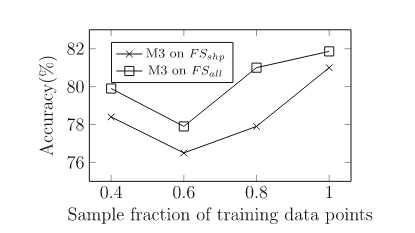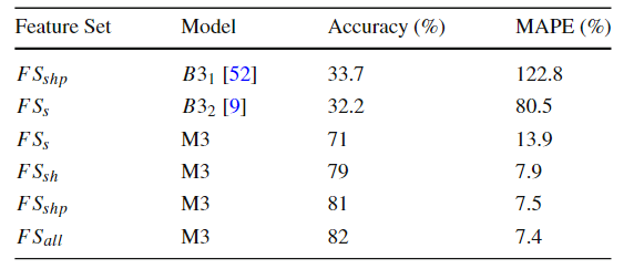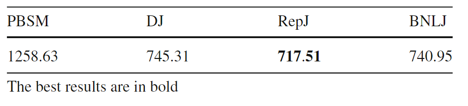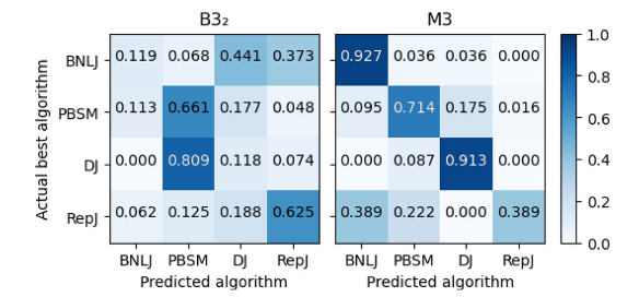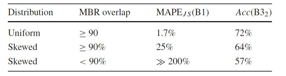 在基于Spark的大空间数据管理系统Beast上实现了四种原始设计的空间连接算法。合成数据使用开源的Spider生成器生成,实际数据从UCR-Star下载,选择了OSM建筑、湖泊和道路数据集,以及US Census线性水、边缘和面数据集。模型在合成数据上进行训练,测试数据包含合成数据和真实数据的混合。Baseline B3 for M3:使用基于规则的模型B31和基于成本的模型B32对于理论模型B1,实验结果如表6(MAPEJS(B1))所示,当应用于均匀分布的数据集,B1准确性较好但当应用于倾斜和非完全重叠的数据集时,性能会下降。对于非均匀数据集,B32在预测最佳或次优连接算法时的准确性会迅速下降(表6ACC(B32))。表6 连接选择性理论模型(B1)和最佳选择算法(B32)的精度一般来说,越复杂的特征将产生更准确的模型。在每个实验中,将特征集FS、FSsh和FSshp应用后续实验中。表7显示了使用特征集FS和FSsh时对连接选择性模型(M1)和基线(B1)的评估。(不使用FSshp是因为分区信息与连接选择性无关)。给定相同的特征集FS,随机森林回归模型M1在MAPE方面明显优于基线B1,提高了12%。对于模型M1,特征集FS、FSsh的不同结果表明具有信息特征的回归随机森林模型可以有效地预测连接查询的连接选择性。 表8显示了使用特征集FS、FSsh和FSshp时MBR选择性(M2)和基线(B2)的效率。由于四种算法中都有一个单独的模型,因此需分别测量它们的性能基线模型B2的MAPE和MAE值几乎是不可接受。相比之下,文章提出的随机森林回归模型M2在MAPE和MAE值上都能得到很好的值。当更多特征输入到模型中时,可以观察到指标的下降趋势(在DJ和REPJ模型有明显的改进)。这一观察结果进一步证实当给定足够的特征来描述输入数据集时,机器学习模型可以优于理论模型。表8 特征选择对MBR选择性估计模型B2和M2的影响表9给出了使用不同特征集时算法选择(M3)和基线(B31和B32)的准确率。结果表明,B31和B32的精度太低,MAPE值不合理时,不能很好地预测最佳算法。它们比完全随机选择略好(完全随机的准确率为25%),其原因是这些模型主要是为均匀分布的数据设计的,而没有考虑到复杂的空间分布。另一方面,所提出的随机森林分类器M3可以提供高达82%的准确率和7.4%的MAPE值。使用FSall特征集的模型产生的精度最高。 图3的混淆举证显示PBSM和REPJ算法的基线(B32)得到了不错的精度(约60%),但对两种算法BNLJ和DJ却效果不佳。为了证明该框架在大型现实世界数据集上的能力,提出“找到世界上所有的交叉道路的问题,可在OpenStreetMap的道路数据集OSM2015/roads上运行一个自连接操作来回答这个问题。使用M3模型表明,就运行时间而言,RepJ是最好的连接算法。之后,我们用给定的输入运行所有的空间连接算法。每种算法的运行时间如表10所示,验证了RepJ实际上是最快的连接算法。 表10不同空间连接算法在OSM2015/roads数据集上的自连接运行时间(秒)固定测试集,并逐渐将训练集从所有可用训练数据的40%增加到100%。图4显示,即使训练集很小,模型在特征集较小的情况下也会表现得更好。还表明添加的连接选择性和MBR选择性有助于提高模型(M3)性能。图4 随着训练集大小的增加,FSshp和FSall特征集在M3的性能PBSM乘数预测是一个回归问题,PBSM乘数的整数作为标签,简单地使用随机森林模型来训练PBSM乘数预测模型。选择基线值等于100,因为这是PBSM乘数最常见的最佳值(如图5)。表11表明,基于学习的模型可以更好地估计出最佳PBSM乘数值,从而缩短空间连接操作的运行时间。 表11 PBSM-Multiplier模型比较