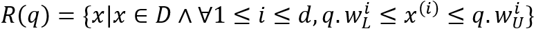 X(n) U],其中,X(i) L<X(i) U(1<=i<=n)。多维窗口查询:给定一个多维数据集𝐷,一个具有窗口约束𝑞.𝑤的多维窗口查询𝑞,返回位于窗口𝑞.𝑤内的点𝑥,即