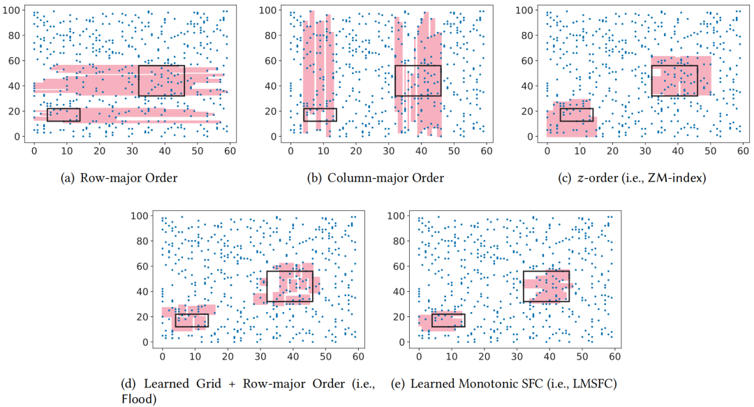 Multidimensional Index based on Learned Monotonic Space Filling Curves》如今,多维数据数量较大,种类繁多。例如,基于位置的服务,如谷歌地图,产生了海量的多维数据,这些数据通常是二维(经纬度)的。在这些多维数据集上,常见和最主要的查询类型是窗口查询,它对几个或所有维度施加范围约束。多维索引是有效地为海量的多维数据集回答窗口查询的关键。空间填充曲线(SFC)是多维索引中最常用的方法之一。SFC具有良好的邻近性保持特性,因此它们是数据降维的理想选择。SFC可分为两类:单调SFC和非单调SFC。单调的SFC,如z曲线,可以快速定位搜索范围。然而,非单调的SFC可能会在查询处理过程中导致更多的计算开销。例如,希尔伯特曲线要求枚举查询窗口边界上的所有值,以确定搜索范围。因此,当使用非单调SFC作为线性化方法时,更难进行范围搜索。最近,通过机器学习优化数据库索引的工作激增。这些方法优化了索引在特定数据和查询工作负载实例下的性能。一些工作也对学习型的多维索引进行了研究,最流行的方法是将多维数据点映射到一维空间中,并进一步在一维空间上应用学习索引。然而,这些工作具有以下的缺陷:(1)多维索引的关键部分是从多维空间映射到一维空间,这部分还未被充分学习到。(2)用于存储降维后的数据的真实物理布局并没有被充分优化。现有的方法通常在每个磁盘页中打包固定数量的数据点,这可能会导致每个磁盘页的最小边界边形(MBR)包含很多的死空间或彼此之间的MBR严重重叠。(3)即使上述两个问题可以在索引构建时得到缓解,现有的查询处理方法仍然需要访问许多页面,因为它们的MBR或z地址范围不可避免地与查询的范围重叠。论文提出的LMSFC可以有效地解决上述问题。(1)设计了一个基于SMBO的有效解决方案来学习一个最优/次优的SFC,以适应不同的数据分布和工作负载。(2)使用dp算法求解降维后数据存储优化的问题,并提出了一个启发式算法进一步提高求解速度。(3)除了上述离线优化技术外,还提出了查询分割算法以进行在线优化。多维数据集:多维数据集𝐷由𝑑维欧几里得空间中的𝑛个点组成。每个点𝑥∈𝐷可记为(𝑥(1),···,𝑥(𝑑)),其中𝑥(𝑖)∈ R𝑑为𝑥的第𝑖个维度值。假设通过适当的缩放,每个坐标的域是[0,2k−1]内的一个整数,因此每个点在每个维度的数值都可以用𝐾位二进制来表示。多维窗口是𝑑维空间上中的超矩形,形式化定义为w =[X(1) L, X(1) U] x