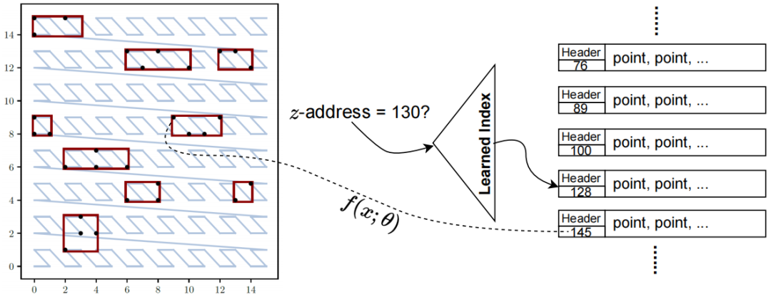 。然而,计算这些极值通常是困难的。在最坏的情况下,可能需要枚举𝑞中的所有𝑥,因此其成本与查询的大小成正比,这与高效查询处理的目的相悖。因此,论文确定了一个SFC的子类(即下面提出的单调空间填充曲线),这样qz就可以在𝑂(𝑑)时间内有效地计算出来,而不依赖于查询的大小。多维空间中的单调函数:记多维数据𝑎≤𝑏为true当且仅当∀𝑖,𝑎(𝑖)≤𝑏(𝑖)。那么一个函数𝑔是单调的,当且仅当对于所有的𝑎和𝑏,如果𝑎≤𝑏,那么𝑔(𝑎)≤𝑔(𝑏)。当某种空间填充曲线对应的映射函数为单调函数,那么称其为单调空间填充曲线。图 1展示了3种常用的空间填充曲线,可以发现,仅z曲线是单调空间填充曲线,即左下角对应的z值为最小的,右上角对应的z值为最大的。受z曲线的单调性的启发,论文提出了一类z曲线,该类曲线中的每个实例都具有独特的属性以支持不同的查询。利用参数θ参数化的SFC表示如下:其中,θ=[θ(1), θ(2)…θ(d)], θ(i)为一个k维的向量,xi j为x的第i维的第j个bit的值,K为xi的最大bit数,θ的作用为将x的第i维的第j个bit映射到z值的二进制位的对应位置。如图 2所示,(a)为传统z曲线使用的交叉编码方式,对应的θ=[[1,4,16],[2,8,32]],最终的z值计算出来就是(0*1+0*4+1*16)+(0*2+1*8+1*32)=56。(b)对应的θ=[[1,16,32],[2,4,8]]。由于不同的SFC将数据集中的点以不同的顺序进行排列,因此在不同的查询负载下查询性能各有不同。这促使我们学习一个好的SFC来适应查询集(详见下一节)。 在图 3中,论文在同一数据集和查询工作负载上,基于不同的SFC,在5个索引上构建和可视化了查询处理成本。首先在一个二维空间中生成了一组随机点,并使用这两个随机生成的查询(表示为粗黑框)作为查询工作负载。图3(a)和图3(b)分别是行排序和列排序,图3(c)使用了z曲线,图3(d)是Flood,一种基于空间的学习网格划分方法,然后使用行序对网格进行排序,图3(e)显示了论文提出的方法LMSFC,它是一个基于学习的单调SFC。查询处理过程中访问到的数据点显示为红色。从图3中可以看出,学习到的索引,即Flood和LMSFC,由于对特定实例进行了学习,访问的数据点更少。基于之前提出的参数化SFC,论文提出了基于学习的单调空间填充曲线LMSFC。如图 4所示,首先学习对应的映射函数f(x;θ),它将采样查询工作负载的查询处理成本最小化。学习到的SFC相当于给定了一个多维数据点的排序顺序。然后,论文提出了一种基于最优动态规划和次优但更快的启发式分页算法来将数据点加载到页面中(图4中的粗红色矩形)。最后,从每个页面中提取最小的z地址来形成一个排序好的数组,并在其上使用一个最先进的学习索引,用于加速根据z地址取出对应数据的过程。学习一个参数化的SFC的目标是找到𝜃∗,从而使所得到的查询处理成本最小化,也就是说,其表示为一个优化问题为: