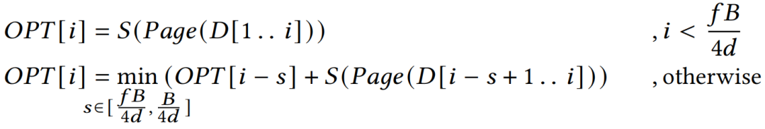。其中,Q表示查询工作负载的分布,而𝑞是该负载中的一个样例,𝑄𝑢𝑒𝑟𝑦𝑇𝑖𝑚𝑒函数返回在给定数据集上的实际查询执行时间。为了优化该方程,可以首先应用有限样本近似,即从Q中获取采样查询,用样本平均值代替期望。然而,𝑄𝑢𝑒𝑟𝑦𝑇𝑖𝑚𝑒函数很难精确地建模或近似,因为它包含了各种复杂的优化。此外,直接评估𝑄𝑢𝑒𝑟𝑦𝑇𝑖𝑚𝑒函数会产生过高的成本。另外,θ是一个高维离散参数,其搜索量是指数级别。因此在实践中不可能通过暴力算法来解决该优化问题。鉴于上述挑战,论文采用了最先进的贝叶斯优化算法SMBO [1]来近似解决上述优化问题,返回一个平均查询时间较低的高质量SFC。并使用随机森林模型来替代典型的高斯过程模型,这提高了学习速度,并且不依赖于多维高斯假设和核函数的选择。为了适应外部IO并允许额外的优化,需要执行分页,它将数据集𝐷划分为多个页面。假设每个页面的最大大小为𝐵字节,并且必须满足由𝑓∈(0,1]指定的最小填充因子约束。也就是说,在每个页面中使用的字节数必须在[𝑓𝐵,𝐵]字节的范围内。寻找最优的分页方法是NP难问题。传统的基于SFC的索引采用固定分页大小的方法,每次都需要加载同样大小的数据。对于基于SFC的索引来说,分页是很重要的。这是因为可以在每个页面中记录数据点的MBR,并使用MBR来进一步优化查询处理。如果页面的MBR与查询不相交,则可以跳过页面。默认的一维分页方法,如固定大小的分页方法,不知道页面的MBR,也不能对其执行主动优化。基于上述的观察,作者设计了一个评分函数S(P)来表示页面的密度,即S(P)=vol(P)/size(P),其中vol(P)和size(P)分别表示MBR的大小以及该页面内的数据量。然后,将寻找最优分页问题转换成寻找使得S(P)之和最小的分页问题,即