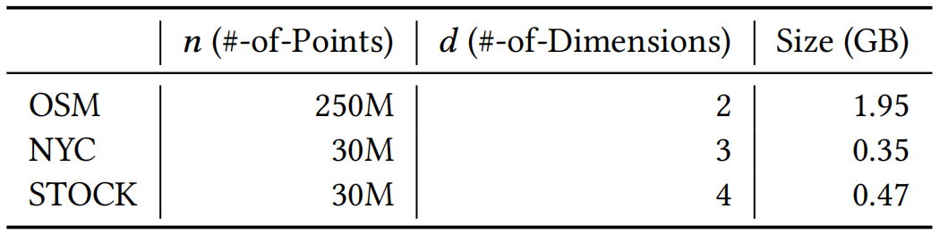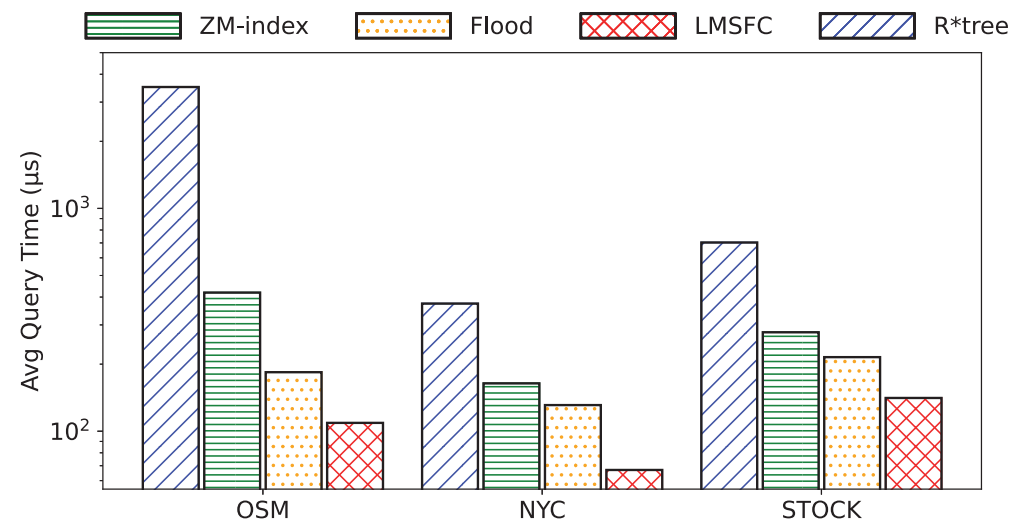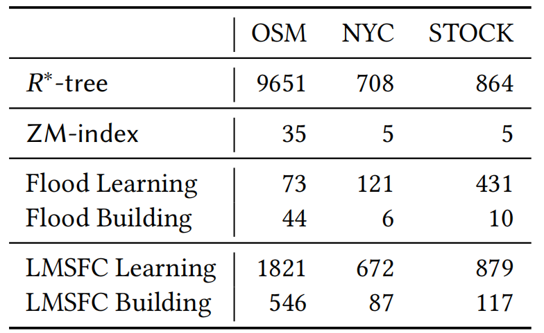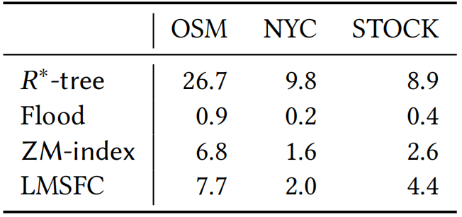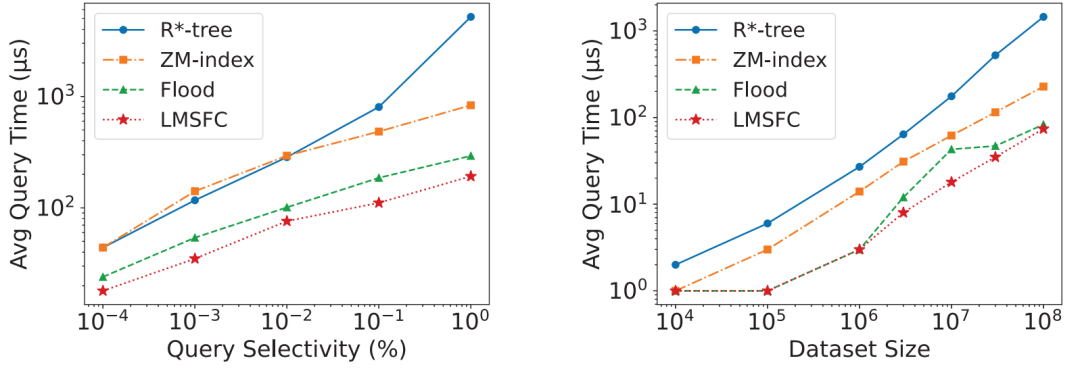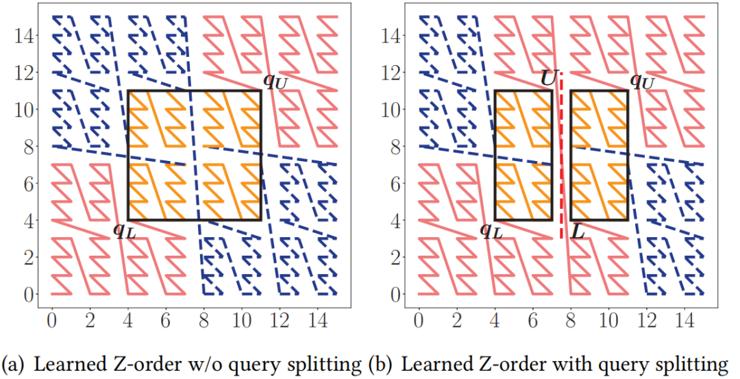 ,其中size(pj) ∈[𝑓𝐵,𝐵]。下面,首先介绍一个基于动态规划(DP)的最优求解上述问题的算法,然后是一个次优但快速的启发式算法。这两种方法都比固定大小的分页实现了更好的分页布局,从而提高了查询性能。由于SFC为数据点提供了一个线性顺序,因此能够通过动态规划最优地求解一维分页问题来规避多维分页问题的NP-hard问题。记𝑂𝑃𝑇[𝑖]是对前𝑖个数据点的最优成本分页算法获得的最优代价。然后,可以推导出以下递归方程:该方法的时间复杂度为𝑂(𝑛𝐵/4𝑑),因为评分函数𝑆可以通过增量计算以𝑂(1)时间进行计算。然而在实践中该方法依旧十分耗时,因为B通常是一个较大的值。因此,论文进一步提出了一个启发式算法来快速计算分页方法。该启发式算法是一种贪心算法,它将尽可能多的数据点打包到当前页面中,直到违反某些条件。该条件规定,新的MBR(通过将当前数据点添加到页面中而形成)不应将旧的MBR放大超过𝛼倍(𝛼>1是一个超参数)。这个条件减少了结果页面的MBR变得太大的机会,其中一个大的MBR可能与很多无用的查询相交。在之前已经提到,使用基于SFC的索引回答查询𝑞,需要两个步骤:1)给定一个空间查询矩形𝑞,确定其在z地址中的扫描范围,记为[𝑓(𝑞𝐿),𝑓(𝑞𝑈)]。2)扫描:所有z地址在此范围内的页面都需要进行扫描。可以使用正向索引找到这些页面。此外,由于LMSFC为每个页面维护了MBR和特定的排序信息,因此可以跳过不相关的页面,并只扫描页面的相关部分。上述框架的主要局限性是,它忽略了由于SFC映射而导致的z地址范围内潜在的大量假阳性数据点。如图 5(a)所示,查询对应的z地址范围可以分成蓝色部分(假阳)和黄色部分,可以看出额外的开销(即蓝色部分)是比较大的。因此,论文提出了基于查询分割的策略来缩小该开销。比如,在图5(a)中考虑相同的查询(黑色矩形)我们可以通过在𝑥轴上的值8处进行切割,将查询分成两部分,如图5(b)所示,可以看到蓝色部分可以被有效地减小。论文首先讨论了如何将一个查询精确地分割为两个子查询,然后将其推广为基于递归的方法以分割成多个子查询。该过程计算比较多,建议参考原论文。实验平台:CPU:i9-7900X;内存:64GB;操作系统:Ubuntu 20.04.4。编程语言:C++。数据集:论文一共使用了3个数据集进行评估,1)OSM:一个空间数据集,由OpenStreetMap数据集中从北美随机采样的250M条记录组成。使用GPS坐标(即经度和纬度)来形成一个二维数据集。2)NYC:从纽约市2018年和2019年的黄色出租车旅行记录中随机抽取。使用上车位置、旅行距离和总量来形成一个三维数据集。3)STOCK:包括从1970年至2018年的每日历史股票价格,包括四个特征:最高价格、最低价格、调整后的收盘价和交易量。具体参数如表 1所示。查询负载:查询通过其在每个维度中的中心和范围进行生成。以以下两种模式之一生成查询中心:1)倾斜,其中查询中心是随机抽样的数据点。2)均匀,其中查询中心在数据空间内随机生成。每个维度中的查询的宽度从0均匀地采样到该维度的数据空间的宽度,其比例为0.05。所有的查询窗口都被剪切为在数据空间内。最终的查询工作负载是通过混合90%的倾斜查询和10%的统一查询来获得的对比方法:1) ZM-index,一个结合Z曲线和学习索引的方法;2) R*-tree,传统的多维索引;3) Flood,较新的多维学习索引。如图 6所示,LMSFC在所有数据集上都优于所有其他索引。与亚军相比,LMSFC在查询时间上提高了1.52×到1.96×。LMSFC相对于基线(即z阶曲线)的主要优点是,学习到的SFC在映射到一维地址空间后,能更好地保持数据的局部性。因此,多维空间中的近距离点更有可能被分配到同一个页面中。选择率(图 7左):对于所有的方法,由于访问了更多的数据点,查询时间近似地随着查询选择性的线性增长。注意到,当查询选择性变大时,R*-tree会恶化;这可能是由于𝑅-tree及其变体需要对每个内部节点执行复杂的MBR交集查询,并可能导致许多回溯(特别是对于更高维的情况),在查询窗口较大时该现象会更加严重。学习型SFC只需要扫描特定z地址范围内的页面,并且没有复杂的交集查询或回溯。与ZM-index相比,Flood效率显著提高,而LMSFC进一步持续提高了查询性能,展示了学习索引的广泛适用性。伸缩性(图 7右):可以看到,所有的索引都与数据大小近似线性扩展,而LMSFC表现最好,其次是Flood、ZM-index,最后是R*-tree。图7 不同查询大小(左图)以及数据大小(右图)实验从表 2中可以看出,论文提出的LMSFC比ZM-index或Flood具有更大的索引大小,其中一个原因是LMSFC为了优化页面布局占用了一定空间。尽管如此,LMSFC的索引大小仍然是可以接受的,因为它仍然明显小于传统的R*-tree。表 3给出了不同索引所需要的构建时间,对于学习索引,论文进一步区分了学习时间和索引建立时间。R*-tree在数据量较大时需要很长的构建时间,因为它在构建的过程中需要对树的结构进行调整。ZM-index具有最快的构建时间,因为不需要学习或优化。Flood比LMSFC的学习和构建时间更快,因为1)Flood的模型更简单,超参数空间比LMSFC要小得多。此外,它还针对学习的成本模型进行优化,因此超参数搜索更快。2)LMSFC还包括其他优化(如基于动态规划的分页),因此也会影响到索引的构建时间。本文介绍了LMSFC,一个基于学习型空间填充曲线的高维索引。论文设计了一个学习一类特殊的空间填充曲线的框架以