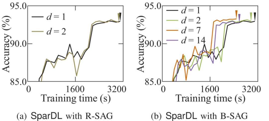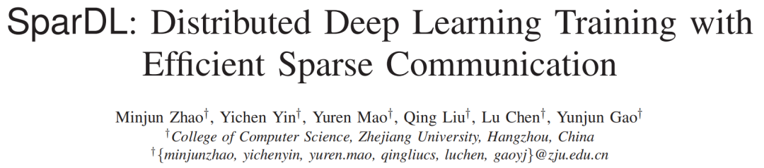 时,带宽下限也随着的增加而增加,因此,与最佳的d = 7相比,较大的d最终会削弱提高速度的效果。对于图14(b)中的12个工作节点,可以观察到R-SAG从2个组增加到4个组时效率的提高小于从1个组增加到2个组时的情况,原因是d = 2的R-SAG在保持带宽成本不变的情况下降低了SparDL的延迟成本,而d = 4的R-SAG在降低相同延迟成本的同时增加了带宽成本。对于B-SAG,d = 4的B-SAG比d = 3的B-SAG慢,这是因为d = 4的B-SAG与d = 3的B-SAG具有相同的延迟成本和相同的带宽成本下限,而d = 4的B-SAG的带宽成本上限更高。此外,如图13(b)所示,d = 14的B-SAG的SparDL达到了最低的测试准确率。这是因为当d等于集群中的工作节点数量(即P)时,会出现所有工作节点在仅进行一次局部top-h操作后就进行聚合,完全不考虑全局梯度。这导致许多全局重要但局部不太重要的梯度被丢弃,从而影响收敛速度。 论文分析了现有稀疏全规约(All-Reduce)框架的低效率问题,并提出了SparDL来解决这些问题。SparDL首次将多次选择过程与规约散射(Reduce-Scatter)操作相结合,以应对稀疏梯度累积(SGA)困境。此外,SparDL使用全局残差收集算法来收集集群中所有被丢弃的梯度,确保训练快速收敛。另外,Spar-All-Gather算法进一步提高了SparDL的通信效率,并使延迟和带宽成本的比例可调。在对广泛的常见深度学习任务进行实验后,论文发现论文的SparDL与最先进的方法相比,速度提升高达4.9倍,同时保持了相当的有效性。| 重庆大学计算机科学与技术专业2022级本科生,重庆大学Start Lab团队成员。 |
