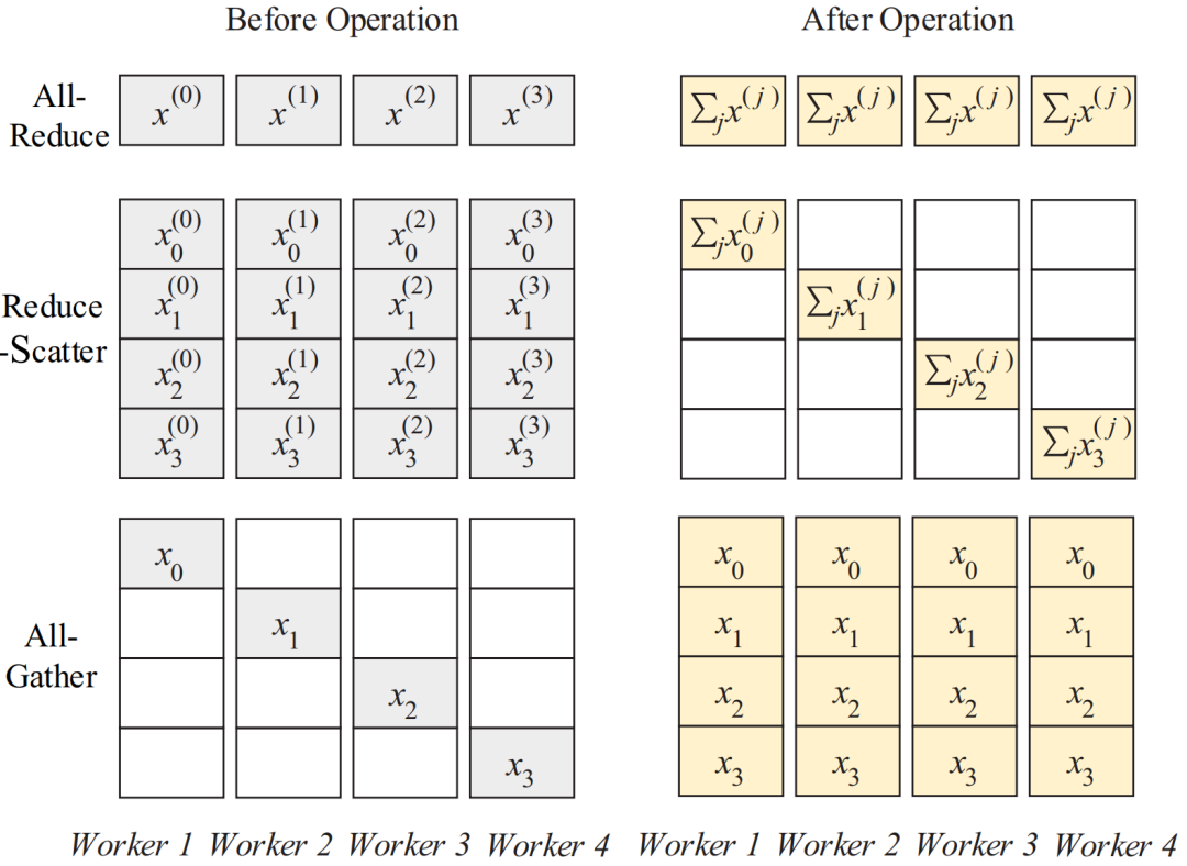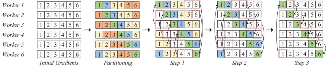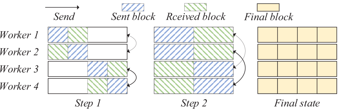 近期,top-k稀疏化技术因其在降低分布式深度学习通信负担方面的效果而受到广泛关注。然而,由于稀疏梯度累积(SGA)问题,这项技术的效果并不总是能达到预期。为了应对SGA问题,研究者们提出了多种解决方案,但这些方法往往存在一些不足,如依赖于效率不高的通信算法,或者需要额外的数据传输步骤。本次为大家带来数据库领域顶级会议ICDE 2024的文章《SparDL: Distributed Deep Learning Training with Efficient Sparse Communication》,论文介绍了一个名为SparDL的分布式深度学习训练框架,它通过结合多个选择过程和Reduce-Scatter操作来解决SGA难题,此外,SparDL使用全局残差收集算法来收集集群中所有丢弃的梯度,确保快速的训练收敛,论文还提出Spar-All-Gather算法进一步提高了SparDL的通信效率。如今,由于数据量巨大以及模型结构复杂,训练深度学习模型变得越来越耗时。为此,许多分布式模型训练技术被提出用于深度学习。其中,数据并行的同步小批量随机梯度下降(S-SGD)被广泛使用。具体来说,当使用S-SGD进行分布式模型训练时,在每次迭代结束时,工作节点通常通过All-Reduce操作同步它们的局部梯度,并使用相同的全局梯度更新它们的训练模型。S-SGD涉及大量的数据通信,Top-k稀疏化是减少通信开销的一种方法,它可以将局部梯度稀疏化为约1%的密度,同时不损害模型收敛性。然而,Top-k稀疏化有时会遭受稀疏梯度累积(SGA)困境。 具体来说,当使用高效的All-Reduce方法同步稀疏化梯度时,所选梯度会经历多次传输和求和步骤以获得全局梯度。由于不同工作节点的稀疏梯度可能来自不同的索引,每次求和都会增加后续传输过程中稀疏梯度的体积,从而导致SGA困境。SGA困境将导致梯度快速增加,甚至可能退化为密集梯度。例如,图1(a)和1(b)分别显示了worker1和worker2的初始3个梯度。在worker2接收到worker1的梯度并将其添加到自己的梯度后,worker2得到5个梯度,如图1(c)所示。随着传输步骤的继续,工作节点的梯度数量增加。SGA困境显著降低了带有稀疏化的分布式模型训练的通信效率。因此,有必要设计一种有效的方法来缓解SGA困境。(a)Worker1的稀疏度 (b)worker2的稀疏度 (c)求和后worker2的稀疏度通信复杂度成本模型: 延迟(α)--带宽(β)模型(α-β模型)被广泛用于分析通信复杂度。在这个成本模型中,α是两个节点之间传输的延迟成本,β是带宽成本。所有通信成本可以建模为xα+yβ,其中x可以视为传输轮数,y可以视为通信过程中一个节点接收的数据总量。All-Reduce、Reduce-Scatter和All-Gather: All-Reduce、Reduce-Scatter和All-Gather是常见的通信操作。图2展示了这些操作,All-Reduce操作通常用于同步和求和来自所有工作节点的梯度,Reduce-Scatter 将梯度各部分归约到对应节点,All-Gather 从所有节点收集梯度各部分。可以看出,依次使用Reduce-Scatter和All-Gather可以实现与All-Reduce相同的结果。 图2 All-Reduce,Reduce-Scatter和All-Gather操作有两种流行的高效All-Gather算法,称为递归倍增(recursive doubling)和Bruck All-Gather,如图3所示。递归倍增算法在工作节点数量为2的幂次方时效果最好,但在数量不是2的幂次方时不能直接使用。相比之下,Bruck All-Gather在任意数量的工作节点上都有较好效果且达到带宽成本下限。对于递归倍增,每个工作节点在第t步与距离为的工作节点通信和交换所有数据。对于BruckAll-Gather,每个工作节点在第t步向一侧距离为的工作节点发送数据,并从另一侧距离为的工作节点接收数据。当工作节点数量为2的幂次方时,递归倍增和BruckAll-Gather的通信复杂度均为: