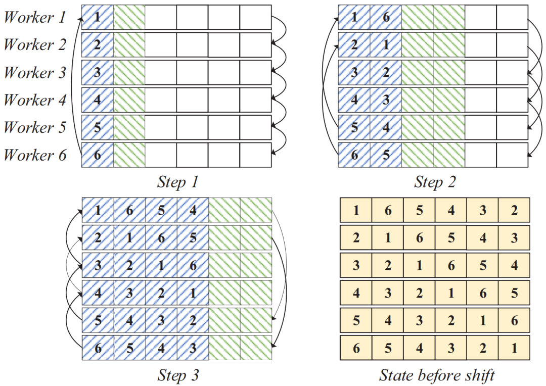 Top-k稀疏化:Top-k稀疏化通常用于高效分布式深度学习中对梯度进行稀疏化,它从密集梯度中选择绝对值最大的k个梯度,其中k通常设置为密集梯度数量的一定比例。Top-k稀疏化不会严重影响学习性能,这已在许多先前的理论和实证研究中得到证明。SparDL框架的如图4所示,对于一个具有P个工作节点的集群,训练开始时,各工作节点通过前向传播和反向传播生成梯度,并结合全局残差收集算法处理梯度。然后,将所有工作节点平均划分为d个组。接着,先利用Spar-Reduce-Scatter算法对每个组内的梯度进行处理,然后通过Spar-All-Gather算法在组间同步梯度,最后在每个组内使用All-Gather操作完成最终的梯度同步,得到全局梯度后各工作节点更新模型。如果设置d=1,则只使用Spar-Reduce-Scatter和一个All-Gather操作就可以完成的梯度同步。在没有其他说明的情况下,这篇论文中的SparDL表示d=1的SparDL。3.2 Spar-Reduce-Scatter算法为了解决SGA困境并且不增加通信复杂度,论文提出了Spar-Reduce-Scatter(SRS)算法,该算法将规约散射(Reduce-Scatter)阶段与多个分块稀疏化过程相结合。此外,论文为Reduce-Scatter提出了一种非递归结构,以确保低通信复杂度,并能在任意数量的工作节点上高效运行,无需额外操作。在这种结构中,一个工作节点的源工作节点和目标工作节点在一次传输步骤中是不同的。图5展示了一个六个工作节点的示例来说明SRS,块中的数字表示块的位置,每个块包含其对应位置的梯度(密集或稀疏)的一部分。 为了阐明SRS算法,论文设d=1,并将SRS分为两个过程:分区和稀疏化传输。对于工作节点 rw(所有P个工作节点中的第w个工作节点),给定第t次迭代(一次迭代包括前向传播和后向传播)的梯度G(w, t)以及上一次迭代(第t-1次)的残差ξwt-1。首先,工作节点 rw 将G(w, t)和ξwt-1相加作为新的G(w, t)。然后,它将G(w, t)划分为P个块{G0(w, t),…,GP(w, t)},并通过选择每个块的前k/P个值来稀疏化其局部密集梯度。然后,将P个块依次划分为一个保存袋B0w和l=⌈log2P⌉个发送袋{B1w,…, Blw}。这些发送袋将在后续传输步骤中用作发送单元,保留保存袋。具体来说,从块G(w, t)开始,将其放入保存袋B0w。然后,将从w+20到w+21的接下来20的个块放入发送袋B1w。重复此过程,直到所有块都放入不同的袋中。请注意,在分区过程中,P个块被视为排成一个圆圈,即如果在分区过程中到达块P,则继续从块1开始放置块。可能剩下的块不足以填满最后一个发送袋Blw,剩余数量将为E=P-2⌈log2P⌉-1。示例 1 图 5 展示了分区过程。假设有 6 个工作节点,以工作节点 1 为例,其中l=3,首先,把第一个块{1}放入保存袋,最后一个发送袋本来应该放置4个块,但工作节点 1 只剩下2个块{5,6}。因此,最后把块{5,6}放入发送袋最后一个发送袋,该袋未满。3.2.2 稀疏化传输(Transmission with sparsification) 将块分区到袋中后,按顺序从最后一个袋Blw到B1w传输所有发送袋中的块。具体来说,对于工作节点rwi中,它将工作节点rw+2^(l-i)视为目标,将工作节点rw+2^(l-i)视为源。它将袋Bl-i+1w发送到工作节点rw+2^(l-i),并从工作节点rw+2^(l-i)接收袋