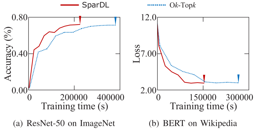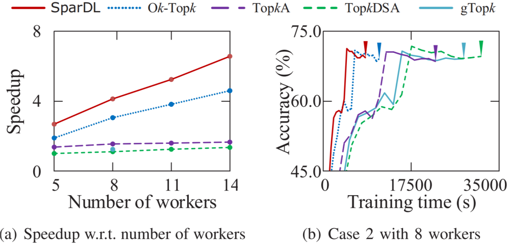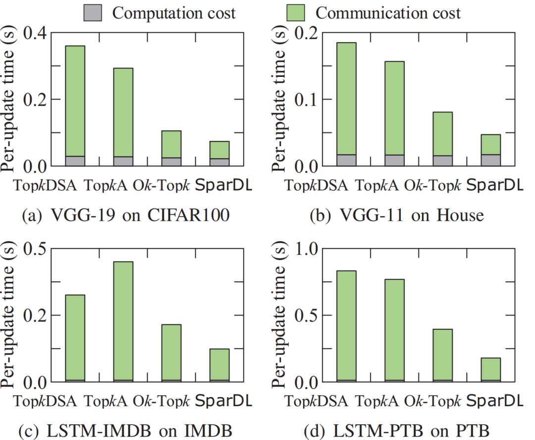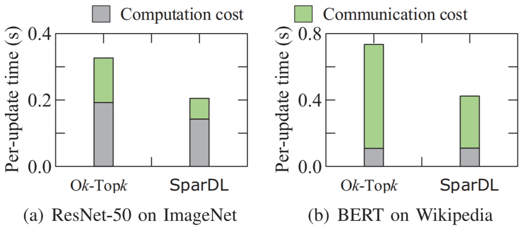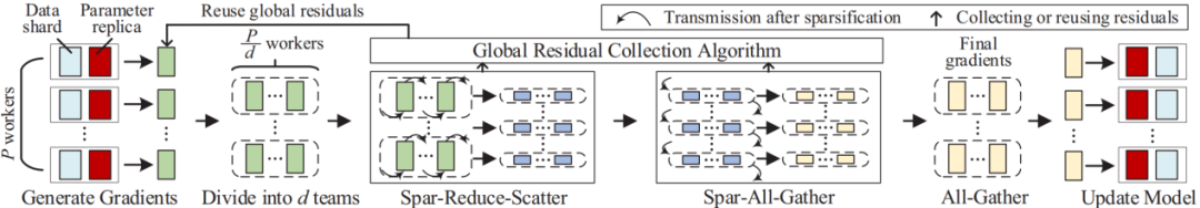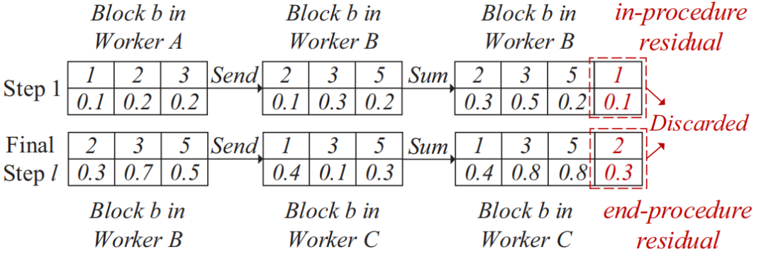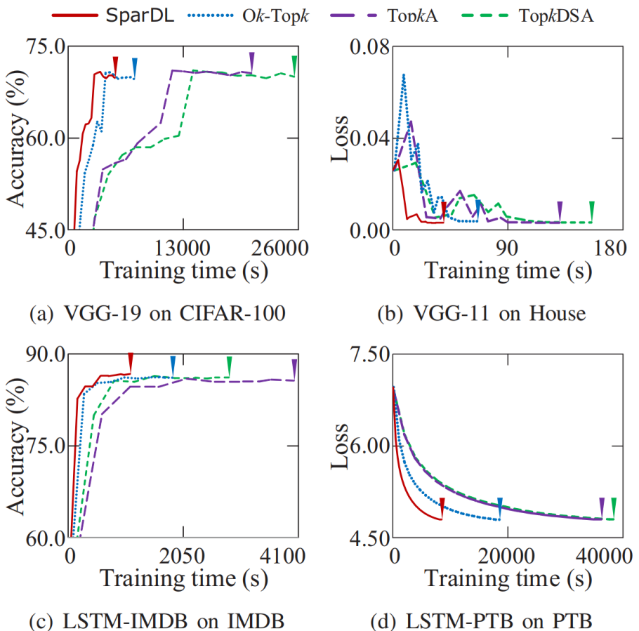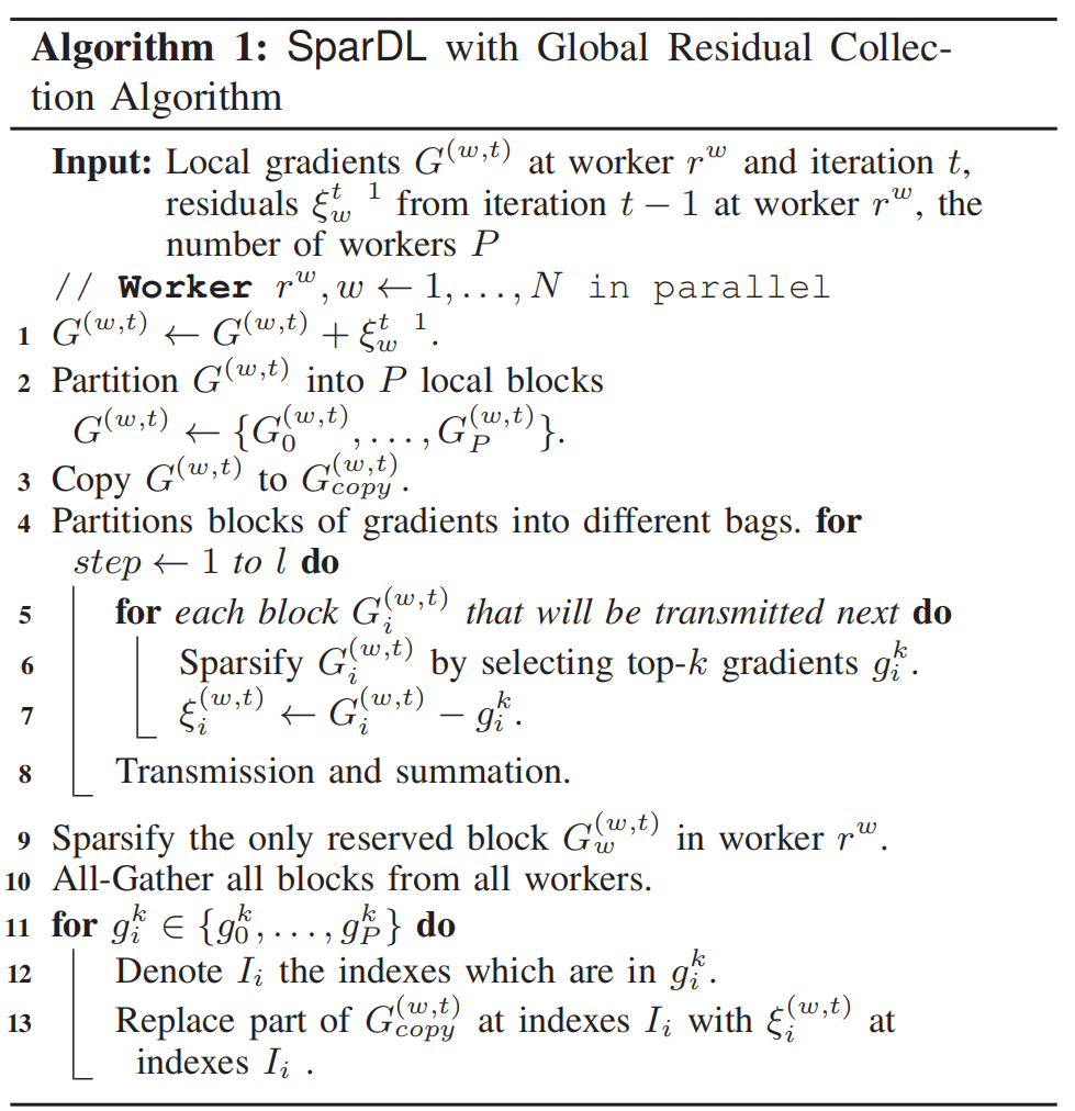 )为4。因此,它将装有2个块的袋B3发送到工作节点5,并从工作节点2接收一个装有2个块的袋。在步骤2,通信距离为2。因此,工作节点1将装有2个块的袋发送到工作节点3,并从工作节点5接收一个装有2个块的袋。在最后一步,工作节点1将装有1个块的袋发送到工作节点2,并从工作节点6接收一个装有1个块的袋。3.3 全局残差收集算法(Global Residual Collection)SparDL在传输步骤之间使用多次top-k选择梯度,虽然解决了SGA困境,但是可能会丢失重要的梯度,继而导致收敛速度变慢。因此,论文提出了全局残差收集算法来存储所有丢弃的梯度,并确保快速收敛。SparDL中有三种类型的丢弃梯度,分别为局部残差、结束残差和过程中残差。局部残差是在每个工作节点本地在传输之前被稀疏化并丢弃的梯度;结束残差和过程中残差都是在传输步骤之间被丢弃的梯度,区别为结束残差的索引不会出现在最终的全局梯度中,而过程中残差的索引仍然存在于最终的全局梯度中。图6展示了过程中残差和结束残差之间的区别,图中,索引为2的丢弃梯度是结束残差,索引为1的丢弃梯度是过程中残差。 现有补偿方法仅收集局部残差或局部和结束残差,但不能收集过程中残差。然而,由于其多次稀疏化过程,SparDL在每个工作节点上会产生大量的过程中残差,这些过程中误差可能会很重要。因此,现有方法不适用于SparDL。为了解决这个问题,论文提出了全局残差收集算法,该算法涵盖了所有三种类型残差的收集。由于过程中残差的索引如同正常的全局梯度一样,仍存在于最终的梯度中,所以无法根据最终索引来收集过程中残差,因此,论文在整个通信过程中对这些残差进行收集。如算法1所示,分两步收集残差。首先,将过程中残差保存在执行稀疏化操作的工作节点上(第8行)。这是因为过程中残差可能来自多个工作节点,收集这些残差需要很高的通信成本,直接将他们保存在执行稀疏化操作的工作节点上可以大大降低通信消耗,尽管这些残差是在处理工作节点上收集的,但从整个训练集群的角度来看,丢弃的梯度仍然被收集,并且迟早会被使用。接着,将局部残差和结束过程残差存储在本地工作节点上(第13-14行)。 3.4 Spar - All - Gather 算法当集群中有大量工作节点时,由于带宽存在上限,带宽成本会收敛到一个常数值,而延迟成本则不会收敛。因此,为了进一步提高SparDL的效率,降低延迟成本并使SparDL能够根据两种成本的重点进行调整十分重要,论文基于分治思想为SparDL提出了Spar-All-Gather(SAG)算法。具体来说,首先将所有P个工作节点平均分成d个组,其中应满足d | P(d整除P)。然后,每个组中的P/d个工作节点并行执行SRS算法。在SRS期间,每个工作节点将其梯度划分为P/d个块,在SRS之后,每个工作节点有一个稀疏梯度块。然后,组之间进行同步操作,同步后的每个组中相同排名的工作节点在有相同的L(k, d, p)=dK/P个稀疏梯度,最后,在每个组中使用Bruck All-Gather。数据集和模型为了全面评估所提出的SparDL在不同场景中的功效,论文采用了五种不同类型的任务:图像分类、图像回归、文本分类、语言建模和语言处理。论文使用了七个不同的真实世界数据集和七个广泛使用的深度学习模型,其中LSTM-IMDB和LSTM-PTB是具有LSTM单元的2层RNN模型,这些模型分别包含1470万、2010万、2350万、920万、3520万、6600万、13350万个参数。深度学习模型和数据集总结在表1中。对比方法论文将所提出的SparDL与四种现有的稀疏全规约(All-Reduce)方法进行比较:gTopk、Ok-Topk、TopkA和TopkDSA。实验设置论文中的所有实验均在PyTorch 1.11.0中使用mpi4py 3.0.3实现。所有实验均在一个具有14台GPU机器的GPU集群中进行评估。每台GPU机器安装有CentOS-7.9、Nvidia驱动程序510.39.01和CUDA 11.6,具有256GB内存、两个Intel(R) Xeon(R) 4314 CPU @ 2.40GHz处理器、一个GeForce RTX A40 GPU。所有机器均以默认设置连接到以太网。4.2 case2、4、5、6在14个节点上训练的性能评估为了验证SparDL框架在通信成本方面的优越性,论文在涉及14个节点的四个不同分布式深度学习案例中将其与Ok-Topk、TopkA和TopkDSA进行比较。这四个案例分别对应图像分类、图像回归、文本分类和语言建模。实验结果如图8所示。从该图中可以观察到,在所有四个案例中,SparDL的通信成本最低。如图8(a),在CIFAR-100上训练VGG-19时,SparDL的通信成本比TopkDSA、TopkA、Ok-Topk分别少6.4倍、5.1倍、1.6倍;在图8(b)中,在House数据集上训练VGG-11时,SparDL是最快的,其通信成本比TopkDSA、TopkA、Ok-Topk分别少5.6倍、4.7倍、2.2倍;从图8(c)和图8(d)中可以看出,在LSTM-IMDB上,SparDL比TopkDSA、TopkA、Ok-Topk分别少2.7倍、3.8倍、1.8倍,在LSTM-PTB上,SparDL比TopkDSA、TopkA、Ok-Topk分别少5.0倍、4.5倍、2.3倍。 为了展示SparDL在减少总体收敛时间方面的能力,论文记录了SparDL相对于基线的训练时间及模型准确率,如图9所示。从实验结果可以看出,SparDL优于所有基线方法,在收敛到与基线方法相似的准确率的同时,展现出最短的训练完成时间。具体而言,如图9所示,对于在VGG-19模型上训练CIFAR100数据集,SparDL分别比TopkA、TopkDSA和Ok-Topk快4.9倍、4.0倍、1.4倍。对于VGG-11模型,SparDL分别比TopkA、TopkDSA和Ok-Topk快3.9倍、3.3倍、1.7倍。对于LSTM-IMDB模型,SparDL分别比TopkA、TopkDSA和Ok-Topk快2.6倍、3.6倍、1.7倍。对于LSTM-PTB模型,SparDLSparDL分别比TopkA、TopkDSA和Ok-Topk快4.6倍、4.3倍和2.2倍。此外,从图9(a)到图9(d)可以看出,使用四种稀疏全