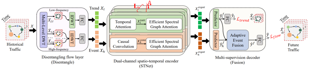 随着科技的不断发展,越来越多的传感器被应用到监测系统当中,例如测速摄像头和环路探测器等通过记录速度和流量等信息,为预测交通流量,便利道路管理提供了极大帮助。然而在时变的交通环境下,由于交通时序的复杂变化和传感器之间的空间相关性,交通预测具有很大的挑战性。一种常见的解决方案是直接将交通数据喂给一个时空网络模型如STNet当中,采用基于序列和图结构的深度模型方法,以端到端的训练方式来处理时空依赖关系。但其流量预测仍然存在一些问题:1. 在时间方面,由于交通时间序列与多个局部独立模块耦合,并且局部独立模块可能发生分布偏移,因此可能导致端到端STNets过拟合。2. 在空间方面,完全基于GAT(图注意力网络)的是学习效率成本较高,时间复杂度和空间复杂度都为O(n2),且由于只考虑值的空间信息,可能会造成过拟合。为了解决这些问题,该论文提出了一种新的交通预测框架STWave。该框架利用离散小波变化DWT将交通时间序列分解成双尺度趋势-事件的形式。然后STWave设计了一个STNet,利用相应的顺序和基于图的方法对不同的信息捕捉各种时间和空间变化的相关性。此外,针对GAT方法的高复杂度和结构信息不足的问题,STWave还提出了一种新的查询采样策略和基于图的小波位置编码方法。最后,在STWave中使用自适应事件融合模块,将不准确的预测事件中的有用信息合并为易于预测的趋势。下图阐述了STWave 框架,它由以下三个重要组件组成1. Disentangling flow层: 给定所有传感器的历史流量数据,STWave首先利用多层离散小波变换(DWT)将所有传感器的耦合历史时间序列分离成一个低频组件和多高频组件。为增强表征能力,STWave按时间顺序采用逆小波变换(IDWT)并在全连接层推导稳定趋势和波动事件。2. 双通道时空编码器: 基于事件的稳定和波动特性, STWave利用时序注意力和因果卷积来捕捉稳定和波动的时间变化。对于时空交通数据的动态空间依赖的学习,STWave采用两种高效的频谱图注意力网络。3. Multi-supervision译码器: STWave利用两个预测器来预测未来的趋势和事件,然后使用自适应事件融合模块来推导未来的流量。DWT可以根据不同的频率使用小波滤波器从输入信号中分离出多个分量,如缓慢变化的稳定趋势对应于低频。因此文章利用多层次DWT通过滤波器获得足够平滑的低高频和多高频分量,其中低高频分量可以代表流量时间序列中的稳定趋势和波动事件。在Disentangling Flow层之后,文章得到了解耦后的交通数据的趋势-事件表示,它们可以在下一步进行并行处理。2.2 双通道时空编码器