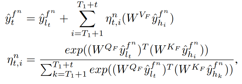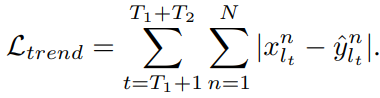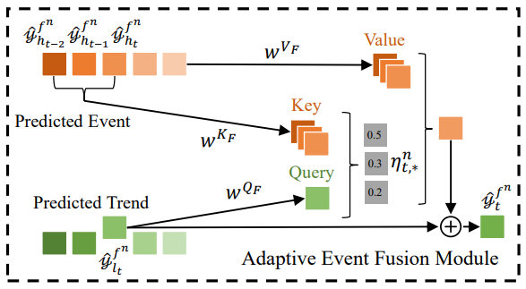 双通道时空编码器通过叠加因果卷积、时序注意力和高效谱图注意网络(ESGAT) L次来捕获波动时间变化、稳定时间变化和空间相关性,其体系结构如图所示论文首先利用GAT在交通时间序列之间传递消息,然后使用topk池来选择代表区域或社区的传感器。然后从topk池中采样S个传感器,通过GAT作为稀疏查询从其他传感器接收最大信息的数量, S由常数采样因子e控制。除此之外,为了有效地将结构信息注入到完整的GAT中,论文还提出了一种新的图位置编码方法, 其有效谱图结构可以表示为:为了将双通道编码器编码的学习表征转换用于预测,论文在时间维度上使用预测器(即全连接神经网络)来推导出未来趋势和事件的表征。然后利用全连接层将趋势投影到一维值上并在模型中通过L1损失来定义监督并实现:另一方面,论文对趋势中每个时间片的事件进行加权求和,权重由注意力计算,并可以通过反向传播学习,即采用数据驱动的方式自适应判断事件是否被准确预测。最终自适应事件融合可表示为:2.4 目标函数