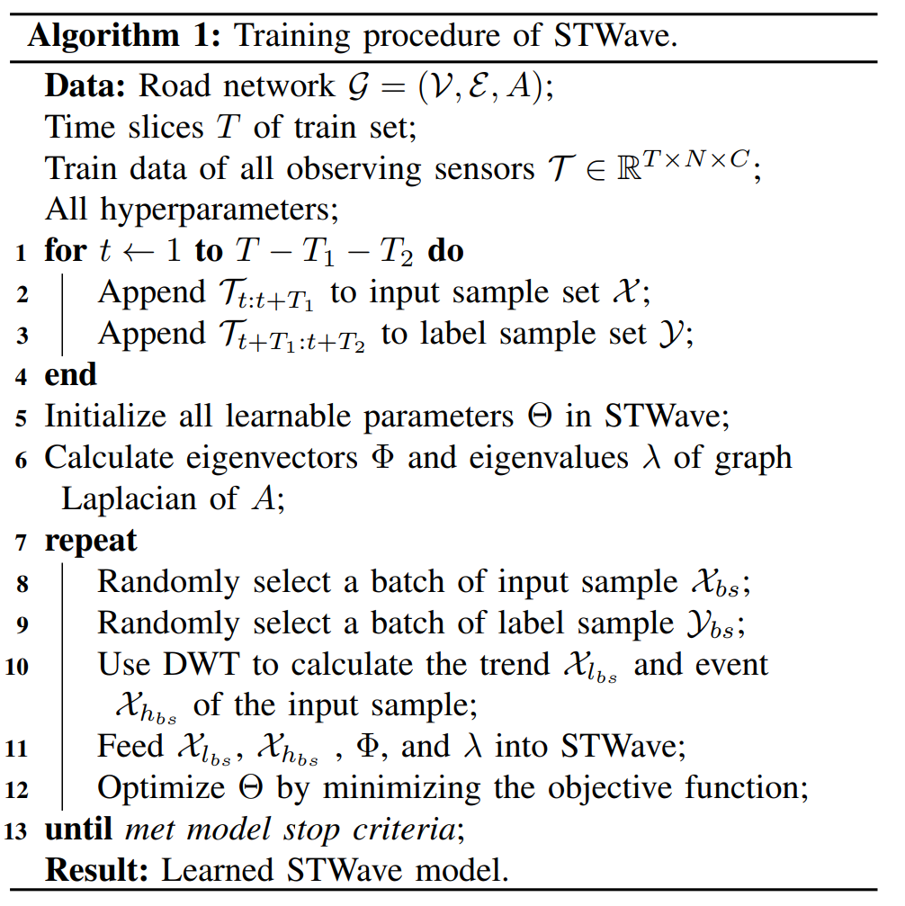 综合考虑流量预测损失和趋势监控损失,STWave的目标是最小化以下目标函数:论文将提出的模型与HA, ARIMA等15个模型进行比较。- 在200轮迭代下使用Adam优化器,并设置批大小为64,初始学习率为0.001。在20轮训练后若损失并没有降低, 则学习率降低十分之一。