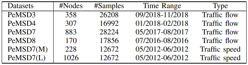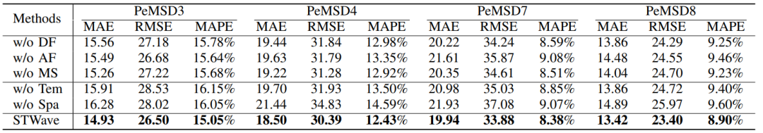 实验在Python 3.8.10环境下使用PyTorch 1.9.1实现,所有的实验都是在一台配置为Intel (R) Xeon (R) hGold 6230 R CPU@2.10 GHz和一张TeslaA 100 GPU卡上运行Ubuntu 20.04.3 LTS的机器上进行的。源码链接:https://github.com/LMissher/STWave论文采用从加州运输机构收集的六个真实数据集来评估模型。它们每5分钟实时采样一次,在以往的研究中被广泛使用。表1 数据集:名称 、节点数、样本数量、时间范围、类型论文使用前12个时间片的观测流量来预测接下来的12个时间片,并按时间顺序将它们分为训练集(60%)、验证集(20%)和测试集(20%)。论文采用三个广泛用于所有任务的指标,即平均绝对误差(MAE),平均绝对百分比误差(MAPE)和归一化均方误差(RMSE)。- STWave中的不同组件(例如ESGAT)如何影响模型性能?