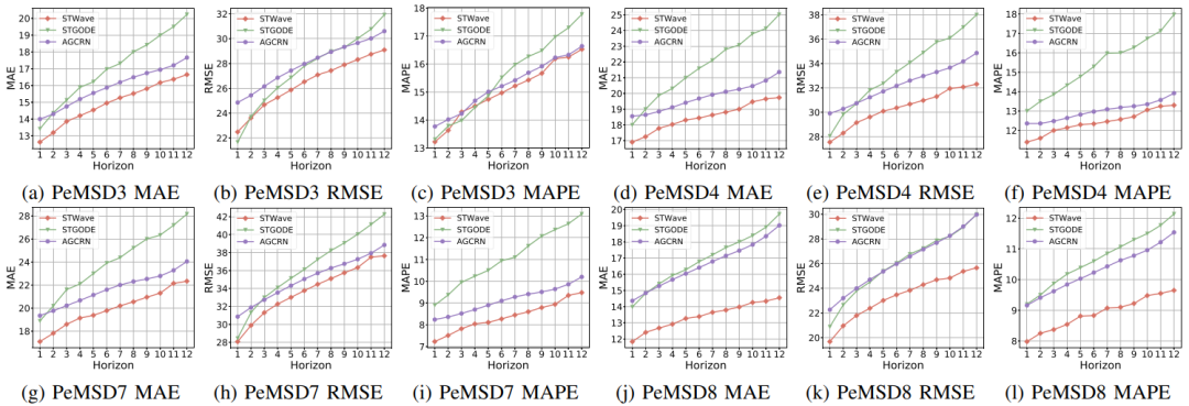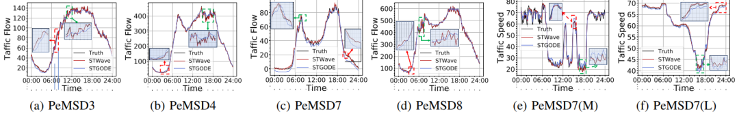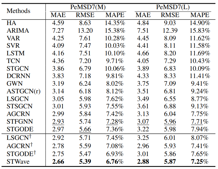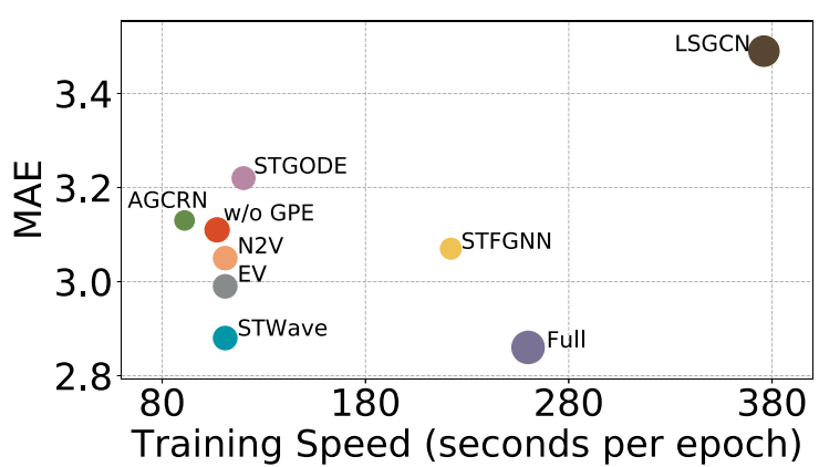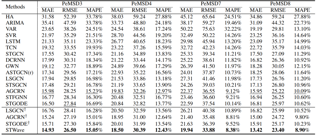 为了解决这个问题,论文同样针对性地提出了如下多个变种并与STGODE, LSGCN, STFGNN等模型进行测试。- "Full": STWave中没有查询采样策略来计算所有空间相关性。