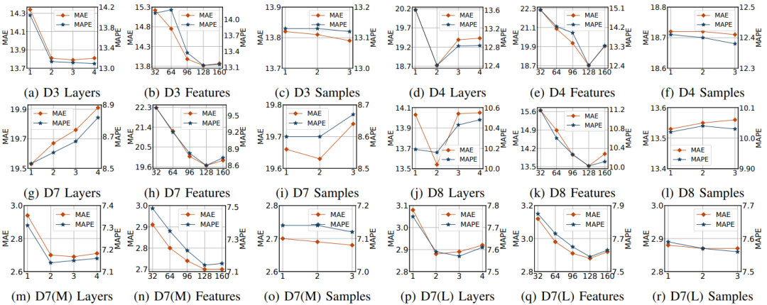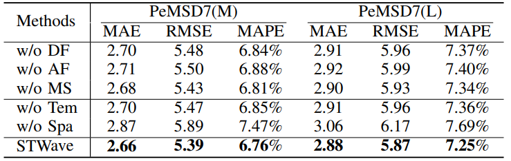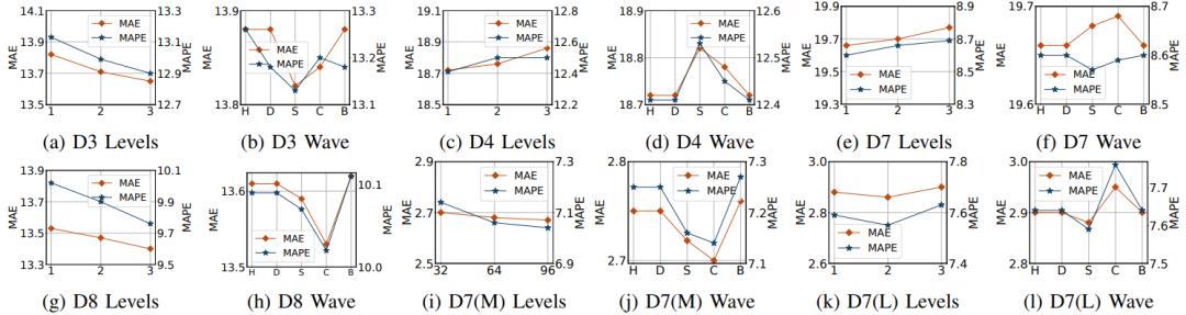 论文进行在 6 个数据集上对 15 种模型进行了对比实验,结果如下图所示:可以发现论文提出的方法在所有数据集下都具有最好的表现。为了解决这个问题,论文设计了消融实验。为验证解耦层的效果,论文分别用LSGCN, AGCRN和STGODE替换了STNet,效果如下图所示:可以发现性能均比STNet效果差。除此之外,论文还分别对框架中的DF, AF, MS, Tem, Spa等步骤或组件进行了消融测试,结果如下图所示:可以发现完整的STWave具有最优的表现,且可以发现“w/o Spa”的结果远差于“w/o Tem”,表明在多变量交通预测任务中,空间维度比时间维度起着更重要的作用。对双通道编码器的层数,STWave中的特征数和ESGAT的采样因子的参数进行测试,分别从[1,2,3,4],[32,64,96,128,160]和[1,2,3]的空间中进行搜索,结果如下图所示:- 模型的性能随着双通道编码器层数的增加而提高,并且当有2层时趋于稳定。