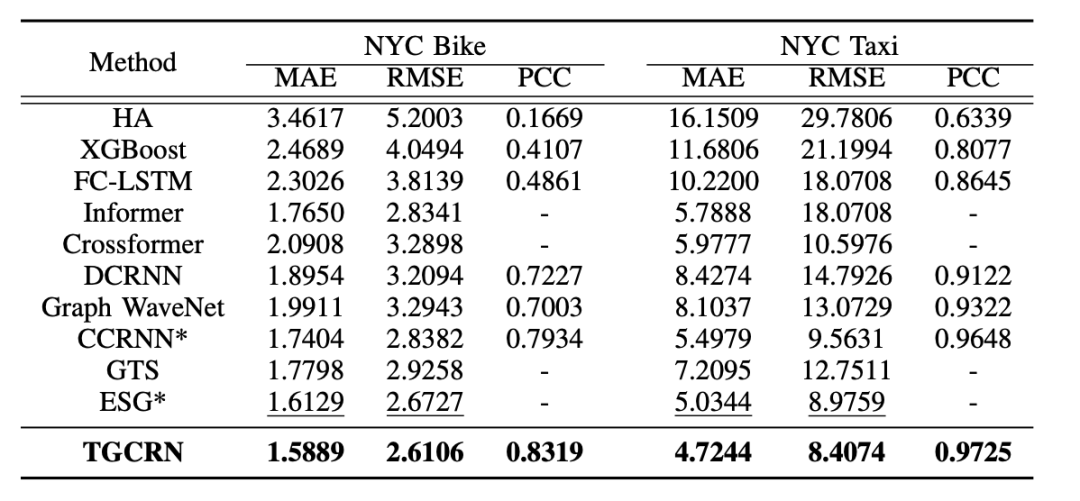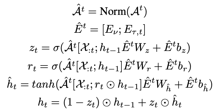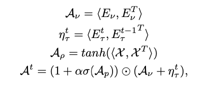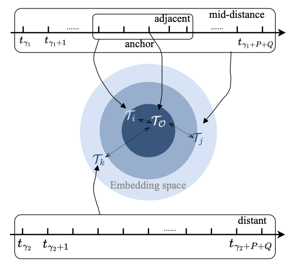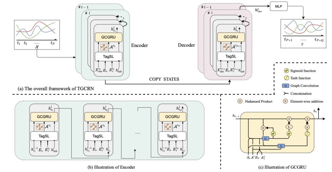 信息物理系统(CPS)具有动态响应物理世界中实时变化的能力,在诸如空气质量预测、天气预报等广泛领域有着重要的意义。由空间分布的传感器生成的时间序列预测是CPS的重要组成部分,使其能够做出明智的决策。然而,大多数现有方法依赖于预定义或自学习的图结构,这些图结构要么是静态的,要么是无意中动态的。因此,要建模那些由于CPS中基础过程的规律性所导致的趋势和周期性变化,仍面临一些挑战。本次为大家带来数据库领域顶级会议ICDE 2024的文章《Learning Time-aware Graph Structures for Spatially Correlated Time Series Forecasting 》。由空间分布的传感器生成的时间序列预测对信息物理系统具有重要作用,能够使其动态调整以适应不断变化的物理世界。这最终在诸如空气质量预测、天气预报、交通规划以及船舶碰撞风险预警等广泛领域中提高了整体效率、可靠性和响应能力。现有的时空预测方法表明,当同时考虑时间和空间相关性时,预测的准确性会显著提高。然而,现有的预测解决方案在捕捉空间趋势和周期性方面能力不足。采用预定义图结构的解决方案需要大量计算和存储资源来预计算空间相关性,而且由于先验假设的不完整,可能还会引入不可避免的偏差。采用自学习图结构的解决方案要么难以表示动态性,要么无法显式考虑动态性的规律性。总体而言,有三个挑战需要解决:挑战1: 如何在时空预测中学习具有趋势和周期性的动态图结构?挑战2: 构建能够随时间变化的图结构不可避免地会引入更多的模型参数,如何让模型能够收敛?挑战3:在时间和空间相关性会动态地相互影响与当前的时空状态会受过去状态的影响的背景下,如何学习动态的时空相关性? 为了解决上述三个挑战,论文提出了时间感知图卷积递归网络(TGCRN)框架。首先,论文构建了具有趋势性和周期性的图结构来表示空间相关性。不同于采用复杂的神经网络,本文将图学习分解为节点和时间表示,然后将它们结合起来构建时间感知的图结构。接下来,论文利用基于图卷积的门控循环单元(GRU)来有效捕捉空间和时间依赖性,这种方法将时间感知图结构上的图卷积与用于整合当前输入和先前状态的门控机制结合起来。最后,论文提出了TGCRN,它采用了一个整合了时间感知图结构学习和基于图卷积的门控循环单元的编码器-解码器架构。这种递归集成允许模型有效捕捉时空相关性的趋势和周期性变化。• 时间差异学习:时间编码函数Φ(·)应满足两个标准,以便有效学习空间趋势。首先,它应符合平移变异性,即时间表示的度量在相邻时间步之间应有所不同。假设一个函数⟨Φ(t), Φ(t + c)⟩ := K(t, t + c),则平移变异性可以表示为K(t, t + c)≠ K(t + i∗c, t + (i + 1) ∗c),其中i≠ 0,c表示时间间隔。其次,编码应保留时间步之间的差异性。例如,08:00和09:00之间的表示应该比08:00和10:00之间的表示更加相似。如图1所示,本文设计了一种基于嵌入技术和自监督学习的时间编码函数。考虑到一个最小周期(例如一天),我们首先将无限时间离散化为以一天为周期的时间戳序列,表示为T = [t0, t1, ···, tmax]。然后我们随机初始化这些时间戳的可学习嵌入向量。为了学习时间步向量表示之间的差异,并使它们与时间域中的距离成比例,本文提出了一个基于距离的比例正则化项来约束时间嵌入。如图1所示,存在三种不同的时间步集合:相邻时间步、中距离时间步和远距离时间步。如果两个时间步之间的距离较近,它们的时间表示更加相似;相反,如果两个时间步之间的距离较远,它们的时间表示应表现出更大的差异。因此,本文设计了如下的目标损失函数: 其中Fsim表示时间表示的相似性,Fdist 表示时间步之间的距离。本文使用欧几里得距离作为Fsim以考虑向量空间中的相似性度量,使用L1距离度量Fdist来保证时间步之间距离的对称性。ti, tj和tk分别表示相邻、中距离和远距离的时间步,这些时间步都是相对于锚点时间步tO进行采样的。这种采样策略和目标损失函数的设计旨在帮助模型更好地学习时间表示之间的平移变异性和差异性,从而在时空数据预测任务中提供更准确的结果.• 周期判别函数:为了区分不同的周期并生成捕捉相应空间相关性的图结构,本文设计了一个周期判别函数。我们观察到,在不同的时间周期中,同一日的时间点节点状态差异显著。例如,在交通流量预测中,同一时间点的交通流量在工作日和周末由于旅行需求不同而表现出不同的模式,这些模式可以从观察数据中提取出来以区分这两者。因此,我们提出了一个判别函数,根据当前节点状态来识别相应的周期。具体地,节点状态可以通过分段非线性函数映射到不同的范围,内积操作进一步扩大这些范围。则学习型时间感知图的邻接矩阵可以用如下方程组表示: 其中,Aν和 Aρ∈RN×N表示自学习的周期判别矩阵,ητ是一个标量,表示趋势因子,σ(⋅)是 sigmoid 函数,⊙表示 Hadamard 乘积,α是一个用于调整周期效应对当前空间相关性权重的超参数。大多数最新的提议采用图卷积网络(GCN)来捕捉时间序列之间的空间依赖性,其主要目标是通过信息传递学习节点表示。显著的图卷积操作采用了在谱域中的“切比雪夫多项式扩展”的一阶近似。给定多元时间序列 X∈RN×Cin,其中包含 Cin维特征向量,卷积可以表示为:Z=LsymXW+b,其中 Lsym是对称拉普拉斯正则化矩阵,W和b是可训练参数,Z∈RN