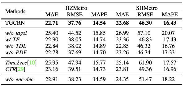 - w/ TE:仅在时间感知图结构学习中使用时间嵌入。