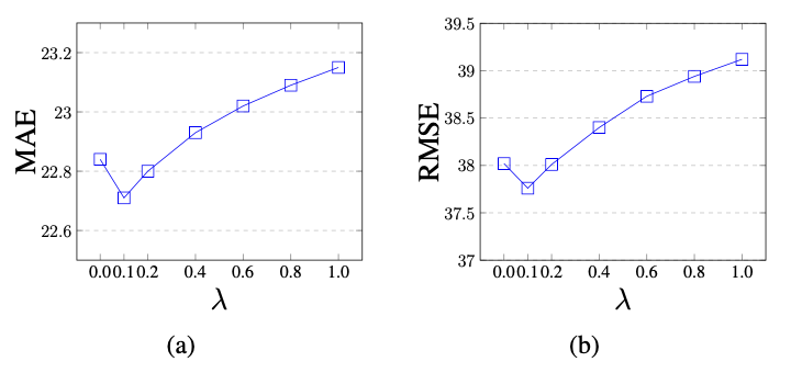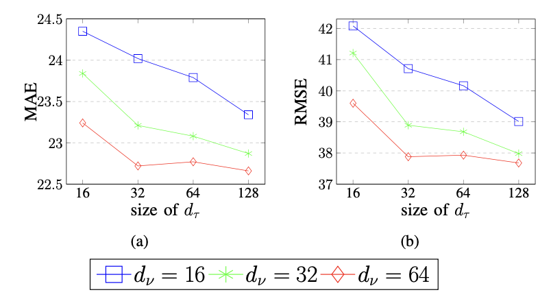 其次,本文采用了最新的显著时间表示方法:Time2vec和连续时间表示来编码时间,以评估本文提到的简单但有效的时间表示的效果。最后,w/o enc-dec 用基于全连接神经网络的直接输出替换递归获得的解码输出。 表3展示了 TGCRN 在 HZMetro 和 SHMetro 上不同变体的结果。不难发现 w/o tagsl 的性能显著下降,这表明时间感知图结构在提供更准确的空间相关性动态方面起到了重要作用。接下来,w/ TE 的结果表明,用于构建时间感知图的离散时间嵌入对于空间模式非常重要。然而,单独利用时间嵌入无法保证学习到有意义的时间表示,因为模型会根据下游任务的预测损失来简单地优化表示。w/o TDL 和 w/o PDF 的结果表明,时间差异学习和周期判别函数对于时空预测都是至关重要的。此外,Time2vec 和 CTR 的结果表明,时间嵌入和时间差异学习的结合更适合该模型。w/o enc-dec 的结果表明,通过多个时间步递归地预测未来值,有助于模型更好地捕捉时空依赖性。表3 数据集HZMetro与SHMetro上的消融实验参数敏感性:本文分析了三个关键参数的影响:节点嵌入维度 dν、时间嵌入维度 dτ和损失权重因子 λ。从图3中可以看出,随着维度的增加,性能持续提高,除了在维度为 64 时(红线)出现轻微波动。TGCRN 在具有较大节点嵌入维度和较大时间嵌入维度时,可以包含更多关于图拓扑和其动态的信息,但同时也会占用更多的参数,这会导致过拟合和更高的计算成本。因此,找到合适参数的一个好的做法是权衡性能和计算成本之间的关系。图 4显示了在 λ=0.1附近的折线出现明显的转折点,这证明了时间差异学习可以相互促进学习到的时间感知图的可解释性和性能的有效性,但不建议将辅助任务的比例设得太大。 论文介绍了TGCRN,一个用于预测空间相关时间序列的新框架。该框架第一个考虑到空间相关时间序列的周期性和趋势动态以进行时间序列预测的研究。作者提出了一种有效的方法,称为时间感知图结构学习,用于利用时间相关的变量间的规律性相关性,并将其表示为图结构。此外,本文提出了 GCGRU 来联合捕捉动态的空间和时间依赖性。最后,作者开发了一个统一的框架,采用编码器-解码器架构,将所提出的图结构学习和 GCGRU 集成在一起,以输出多步预测。在多个真实世界数据集上进行的实验验证了TGCRN相较于最先进的方法表现更优。 | 重庆大学计算机科学与技术专业 (弘深) 2022级本科生,重庆大学Start Lab团队成员。主要研究方向:时空数据挖掘、AI4DB |