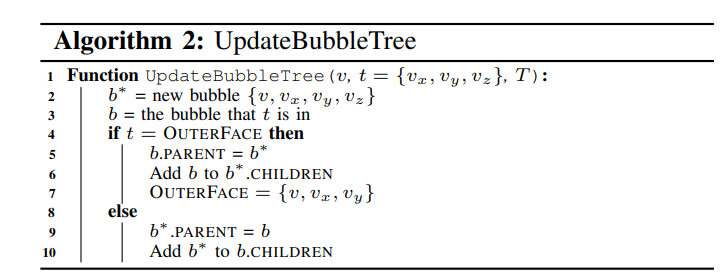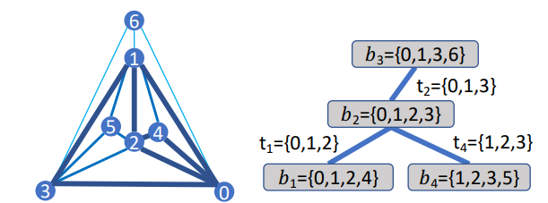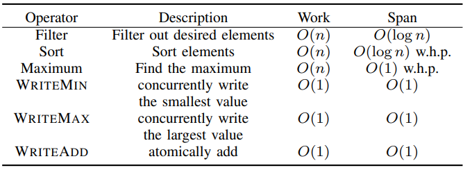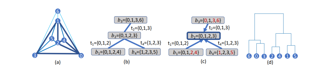 但是,以上组合算法都是顺序性的。为了进一步提升效率,数据库国际顶级会议ICDE2023上的论文《Parallel Filtered Graphs for Hierarchical Clustering》介绍了一种用于构建TMFG的并行算法,并设计了一种新的并行构建DBHT的算法。通过实验表明,使用新构建的算法能够更快和更高质量的聚类。在这一部分将解释顺序构造PMFG和TMFG,以及接下来要使用的符号和相关术语。为了顺序构建PMFG,首先需要将所有的边权升序排序,然后在不违背平面性的原则下,从边权大到小插入构建的图中,其中的平面性指的是能够画在平面之上且各边之间不相交的性质。可以看出,这样的计算复杂度是O(n2)。 为了降低构建PMFG的计算复杂度,TMFG便应运而生。它与一次只插入一条边的PMFG构建方式不同,顺序构建的TMFG一次插入一个节点以及从该节点引出的3条边。这种方法是不用做平面性检验的,因为平面性的定义中已经规定在平面绘制的时候边不能相交,所以TMFG的构建仅需要O(n)的计算复杂度就可以完成。在获取到PMFG或者TMFG之后,便是从DBHT算法中生成用于层次聚类的树状图。构建树状图的步骤分为三步:1、构建无向Bubble Tree(以下称为气泡树);2、构建有向气泡树;3、使用完全链接聚类(complete-linkage clustering)生成层次结构;其中气泡树中节点关联的是PMFG或者TMFG中的一个平面子图,边关联的是分割两个节点代表的平面子图的三角形,示例如下图所示:上图中便是一个TMFG和一棵气泡树。在气泡树中,b1和b2便是平面子图,而t1便是分割这两个子图的三角形Triangle(0, 1, 2)。无向气泡树向有向气泡树转换依据的是方向确定函数,这个接下来会涉及。重要的是完全链接聚类,为了让读者不感到突兀,下面重点解读一下: 完全链接聚类算法是一种层次聚类算法,其核心原则是在每一步聚类过程中考虑聚类内最不相似(即距离最远)的成员。在这个算法中,两个聚类的距离被定义为这两个聚类中最远的两个点之间的距离。当这个距离最小时,两个聚类合并。随着算法的进行,这种方法逐步构建出一个层次结构,其中每个层级代表了不同的聚类粒度。Outer face(以下称为外部面)和Inner face(以下称为内部面)是两个相对的概念。值得注意的是,外部面是没有边界限制的,而相对的,有边界的面被称为内部面。如上面的图1所示,面{0, 3, 6}便是一个外部面,而面{1, 2, 5}便是一个内部面。Parallel Primitives(以下称为并行原语)是指在并行计算中使用的一组基本操作或函数,具体如图2所示:图 2 并行原语