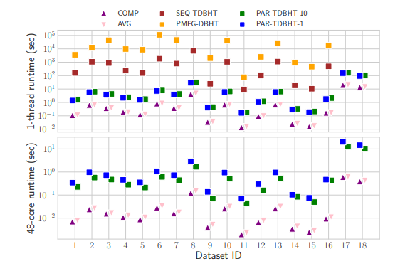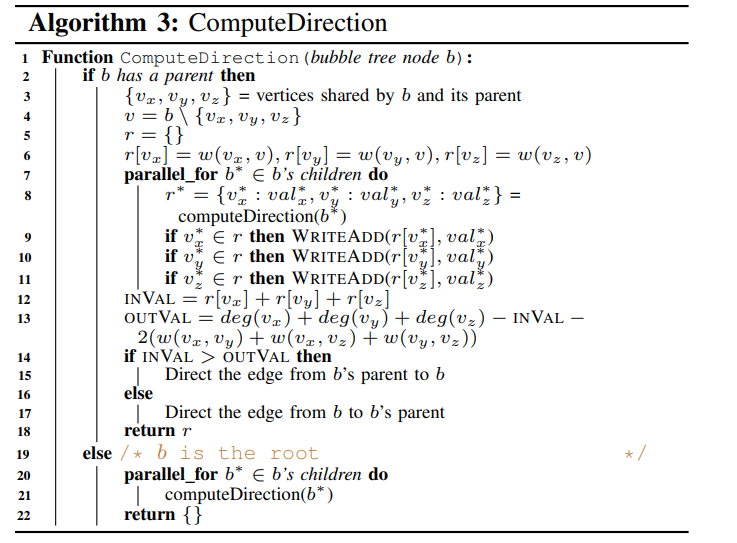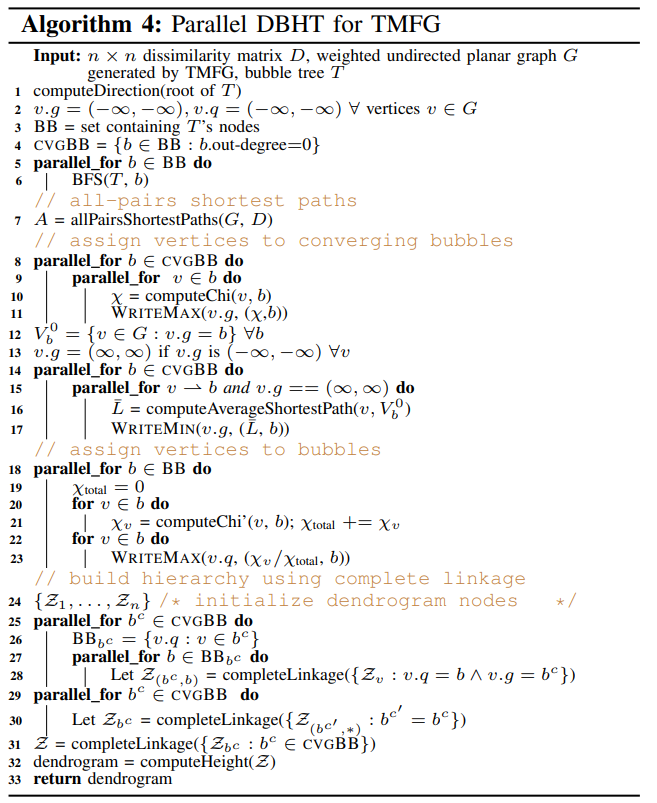 其中值得注意的是WRITEADD操作,它是一种优先级并发写操作,允许在多个线程或进程中同时对同一位置进行安全的增量更新。在解释具体的算法之前,为了方便读者理解,如果必须,会预先给出算法的示例,让读者在示例中总览算法的全貌。 首先,找到在输入的相似矩阵S中每一行中总和最大的四个顶点C{v1, v2, v3, v4},然后将这四个顶点形成的边{(v1, v2), (v1, v3), (v1, v4), (v2, v3), (v2, v4), (v3, v4)}总共6条边加入ξ中,这也形成了四个面{(v1, v2, v3), (v1, v2, v4), (v2, v3, v4), (v1, v3, v4)},然后将其加入Ϝ中,然后将剩下的节点划分给V之中。初始化之后,便是将剩下的节点插入到构建的图中。为了提高效率,算法中的传入了一个批大小参数Prefix,每次插入时先计算批处理节点中插入某个平面后的Gain(以下称为收益函数),然后将节点插入收益函数最大的平面之中,不断迭代,直至没有节点可以插入。图 3 Parallel TMFG Algorithm值得注意的是,图中算法的蓝色标注代码端没有解释,因为这涉及到无向气泡树的构建,这部分将与下一部分以一个示例具体说明。 2.2 Parallel DBHT for TMFG为了让读者更好地理解相关算法,在这里先给出一个示例,如图4所示:图中(a)表示已经构建出来的TMFG,(b)表示在构建TMFG过程中构建出的无向气泡树。在示例中,图中最初存在4个节点,分别是{0,1,2,4},当需要插入节点3的时候,通过收益函数计算出来的最佳插入面是{0,1,2},显而易见,这是一个外部面,所以当节点3插入时,气泡b2={0, 1, 2, 3}将成为气泡b1={0, 1, 2, 4}的父亲节点;当需要插入节点5的时候,通过收益函数计算出来的最佳插入面是{1, 2, 3},这是一个内部面,所以气泡b4={1, 2, 3, 5}将会成为气泡b2={0, 1, 2, 3}的子节点;插入节点6也类似。通过上述案例可以知道,构建无向的气泡树是在构建TMFG的并行化过程之中的,这就比原来算法的效率高很多。算法1的UpdateBubbleTree函数部分如图5所示: 图 5 UpdateBubbleTree Function构建完无向气泡树之后便是确定气泡树中边的方向,这一次先给出该函数的伪代码,因为这是一个递归函数,具体如下图所示:图 6 computeDirection Function首先需要明确的是,方向的确定是通过计算TMFG中连接三角形与其内部INVAl(以下称为内部值)和外部OUTVAL(以下称为外部值)的边的权重之和比较来决定的。在原来的算法之中,计算这两个值是通过BFS算法经过O(n2)时间复杂度得出,但是,在气泡树中,分割三角形(即树边)的子树包含了所有的内部顶点,而树边所指的父亲包含了所有的外部顶点。利用这个特性,可以通过上图的递归函数在O(n)计算复杂度内实现以上两个值的计算。 从给的示例图4中(c)可以演示上述算法的执行过程:首先,从根节点b3开始,由于根气泡没有父节点,所以递归到子节点b2,即b=b2,该节点与其父节点分割面为t2= {0, 1, 3},剩下的顶点v = 2,所以,初始化r[0] = w(0, 2), r[1] = w(1, 2), and r[3] = w(3, 2),接下来便是向下递归b2的子节点b1,b4。由于b1,b4操作是一致的,以下仅示例b1相关。对于b1来说,r*[0] = w(0, 4), r*[1] = w(1, 4), and r*[2] = w(2, 4)。因为vx* = 0 ∈ r and vy* = 1 ∈ r,所以r[0] += w(0, 4), r[1] += w(1, 4)。对b4做一样的操作之后,得到:r[0] = w(0, 4)+w(0, 2),r[1] = w(1, 4)+w(1, 2)+w(1, 5)以及r[3] = w(3, 2)+w(3, 5)。得到以上结果之后,按照算法中的公式得到内部值和外部值,通过比较之后,得到b3指向b2。完成有向气泡树构建之后便是Assigning Vertices(以下称为顶点分配)和构建树状图。其中重要相关的术语为converging bubble(以下称为收敛气泡),它是指在气泡中只有入边没有出边的节点。具体伪代码如下图所示: 图 7 Parallel DBHT for TMFG首先,第一级聚类将每个顶点分配给唯一的收敛气泡。如果一个顶点至少在一个收敛气泡中,那么它将被分配给具有最强连接的收敛气泡。对于TMFG,所有的泡泡都有6条边,因此可以简化为将顶点分配给具有最大连接权重的收敛气泡。对于那些不在任何收敛气泡的顶点,它们将被分配给具有最小平均最短路径距离的收敛气泡。具体而言,对于每个顶点v,计算它与收敛气泡b之间的平均最短路径距离,然后将v分配给具有最小平均最短路径距离的收敛气泡b。 然后,第二级聚类将每个顶点分配给唯一的气泡,但不一定是收敛气泡。对于每个顶点v,将其分配给最大连接得分的气泡b。其中连接得分χ'(v, b):即是气泡b中所有边的权重之和除以气泡b中所有边的数量之和。顶点分配之后便是使用Complete Linkage算法构建树状图。该算法被用于构建三个层次的树状结构:intra-bubble、inter-bubble和inter-group。首先,对于每个intra-bubble,即同一个收敛气泡中的顶点,运行Complete Linkage算法,得到一个intra-bubble的树状结构。然后,对于每个inter-bubble,即不同收敛气泡中的顶点,运行Complete Linkage算法,得到一个inter-bubble的树状结构。最后,对于所有的inter-group,即不同分组中的顶点,运行Complete Linkage算法,得到最终的树状结构。实验环境设置在在Amazon EC2的c5.24xlarge机器上进行实验,该机器配备了2个Intel Xeon Platinum 8275CL(3.00GHz)CPU,共48个超线程核心和192GB的RAM。默认情况下使用所有带有超线程的核心。对于C++编码的代码,使用版本为7.5的g++编译器,使用O3加速和ParlayLib库进行并行编程。图 8 Data Sets used in Testing为了展示算法的优越性,将所有的层次聚类算法与Prefix = 1和Prefix = 10的并行化算法(下图分别为PAR-TDBHT-1,PAR-TDBHT-10)作比较,结果如下图所示: 从上图可以看出,Sequential PMFG-DBHT在单线程的情况下比PAR-T