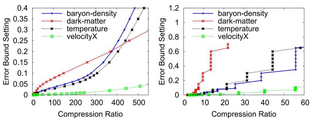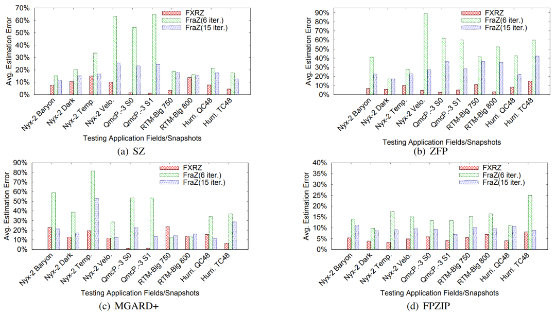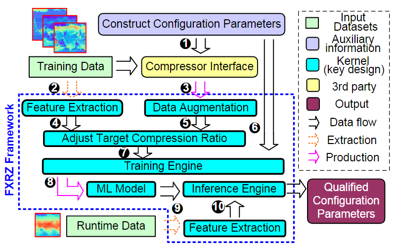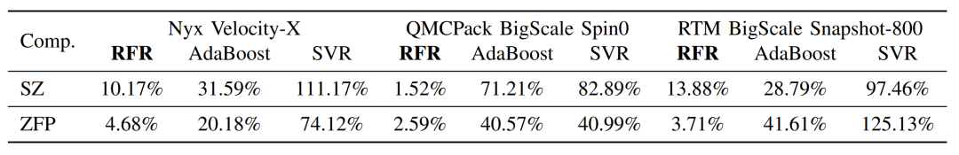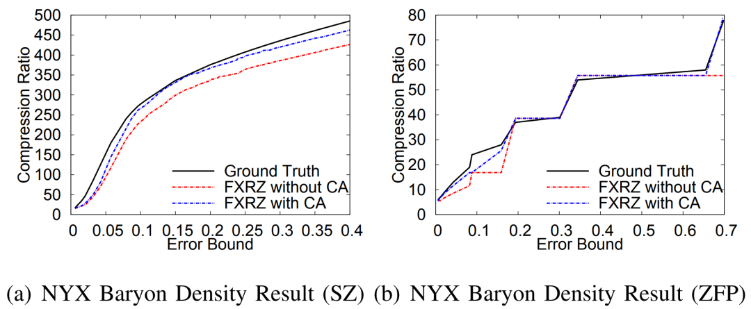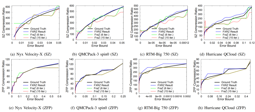 当前科学应用或仪器在模拟或进行数据采集的过程中往往会产生海量的数据,诸如Nyx这样的宇宙学模拟应用每次运行可产生数百PB的数据。因此,如何大幅压缩这些数据以更好地利用可用计算资源是当今科学数据管理的一个研究重点。利用数据压缩技术解决科学大数据问题已经取得了重大进展。一方面,目前已有多个库/工具包(如H5Z filter、pNetCDF-SZ)实现了面向科学数据库/格式(HDF5, ADIOS2)为用户提供透明的无损/有损压缩处理。另一方面,近年来针对科学数据集也开发了一些误差有界的有损数据压缩算法(如SZ、ZFP、FPZIP、MGARD等),根据用户指定的误差边界尽可能地提高压缩率。 然而,为了优化数据管理、存储或传输性能,开发一种有效的“固定比率压缩机制”在实践中也是至关重要的。具体来说,系统需要在控制数据大小的情况下执行数据压缩,其适用场景主要是基于受限的数据传输带宽/存储空间/内存空间尽可能地保持最佳数据质量。现有的误差有界有损压缩算法根据绝对误差界、相对误差界和峰值信噪比(PSNR)等多种类型的误差指标进行压缩,但遗憾的是不能够根据用户需要的目标压缩率来压缩数据。为此,FRaZ进行了对构建通用的固定压缩率有损压缩框架的首次尝试,但其基于试错的迭代搜索方法计算开销过大,往往与压缩时间在同一数量级或者更甚,难以适用于数据的在线压缩处理。为了解决上述问题,论文尝试分析了数据特征与压缩率之间存在的联系,并进而提出了一种高效的、与压缩器无关的特征驱动的固定压缩率有损压缩框架FXRZ。它可在运行时有效地提取并分析数据特征,并借此根据用户指定的目标压缩率提供最合适的误差边界配置。给定一个多维科学数据集D,一个误差控制的有损压缩器C (SZ, ZFP, FPZIP 或 MGARD+) 和一个目标压缩率(表示为TCR),FXRZ从数据集D中提取关键数据特征并估计误差边界设置(表示为Ep),使得在Ep下实际测量的压缩率(表示为MCR)足够接近目标压缩率(表示为TCR)。最后,将MCR与TCR进行比较以验证FXRZ的准确性。因此,对于给定的D、C和TCR,本论文的研究目标是以较低的性能开销最小化MCR和TCR之间的差异,即min(|MCR-TCR|)。 FXRZ的基本设计思想是从训练数据集中探索关键的数据特征,并使用有效的数据增强技术快速生成充足的压缩结果(其中只有极少部分需要进行压缩)进行ML模型训练,然后在运行时利用该模型来预测目标压缩率所需的最佳误差配置。其整体设计框架如下图所示:1)特征提取模块:特征提取模块用于提取数据的分布特征,用于在训练阶段②构建ML模型,并在推理阶段⑨作为输入参数预测最佳的合格误差界设置。2)数据增强模块:数据增强模块是对运行不同有损压缩器①和③所产生的压缩结果进行增强。3)模型训练模块:训练模块是FXRZ的核心模块,它根据提取的特征向量④、增强的压缩结果⑤和相应的配置参数⑥三部分信息进行ML模型的训练工作,并基于动态目标压缩率调整策略⑦优化误差界估计。 4)推理引擎模块:生成训练良好的ML模型⑧后,借助推理引擎模块,即可根据运行时提取的特征向量⑩,预测最合格的误差边界设置,从而达到目标压缩率。由于ML模型训练阶段需要掌握尽可能多的在不同数据集和不同误差界设置下的压缩率情况,这将不可避免地导致执行大量的压缩操作。因此,通过运行有损压缩算法生成大量压缩结果样本的代价是非常高昂的。对此,论文提出使用基于插值的数据增强方法以减少所需的压缩操作。以图2为例,论文发现有损压缩器在相近的误差界下的压缩率是非常接近的。虽然误差界与压缩率之间不是线性关系,但两个连续的驻点之间的关系近似为线性关系。因此,可以利用线性插值(或最小二乘法)来增加压缩结果样本。具体地说,可以先运行指定的压缩器进行几个有代表性的误差边界设置,以生成一定数量的真实压缩率。将这些结果视为驻点,进而利用线性插值方法得到其他压缩率下的结果。这种增广的压缩结果曲线构成了以压缩率为自变量的误差界设置函数,从而可以在训练阶段为任意给定的压缩率获取一个期望的误差界。论文观察了不同数据特征对有损压缩器效果的相关系数,如表1所示。进而为FXRZ框架选取了Value Range, Mean Value, MND, MLD, MSD五种数据特征,分别为:1)Value Range:数据集的值范围,表示数据集中数据偏离的程度(或数据集的幅度)。2)Mean Value:数据集中所有数据点的平均值。3)Mean Neighbor Difference(MND):平均邻居差值,表示所有数据点与其各邻居的平均绝对差值的平均值。4)Mean Lorenzo Difference(MLD):平均洛伦兹差值,表示数据值与其洛伦兹预测值之间的平均绝对差值。公式(1)(2)分别展示了如何对二维和三维数据集中的数据进行洛伦兹预测。5)Mean Spline Difference(MSD):平均样条差值,指数据集中所有数据点的特定三次样条插值拟合误差的平均值。公式(3)展示了如何对一维数据集中的点计算三次样条插值拟。类似地,对于多维数据集,可利用式(3)分别沿各维计算splinei,并计算其平均值A。最后,考虑当前数据值与A之间的差值作为当前数据点的MSD值。 对于任何数据集,FXRZ使用5个提取的特征和1个目标压缩率作为ML模型的输入。在推理阶段,模型需要能够预测期望的误差界设置。由于误差界的预测值可能是任何浮点数,故而首先排除了分类器模型。进而论文选择了三个流行的ML模型:Support Vector Regressor (SVR),AdaBoo