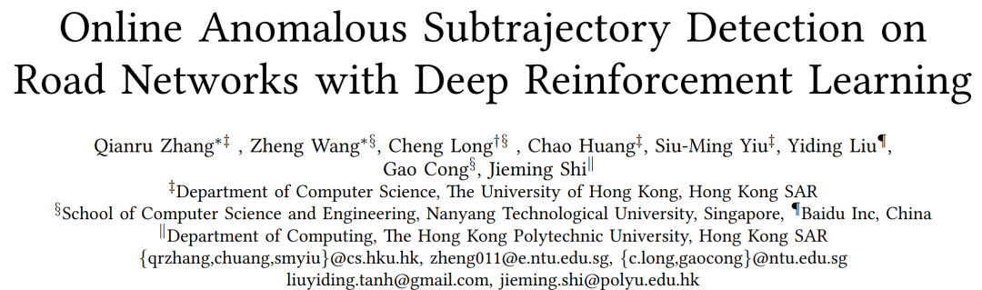 在许多基于位置的应用中,异常轨迹检测已经成为一项重要的任务。虽然针对这项任务提出了许多方法,但它们都存在各种问题,包括(1)无法检测异常子轨迹,这些异常子轨迹是轨迹数据中的细粒度异常,(2)非数据驱动,(3)需要足够的监督标签,这些标签的收集成本很高。本次为大家带来数据库领域顶级会议ICDE 2023的论文:《Online Anomalous Subtrajectory Detection on Road Networks with Deep Reinforcement Learning》。随着GPS设备、智能手机等移动计算和地理定位技术的进步,空间中各种运动物体(如人、车辆)产生了大量的空间轨迹数据。这些收集到的轨迹数据记录了运动物体在不同时间戳的移动轨迹,反映了物体不同的移动模式。在各种轨迹挖掘应用中,异常轨迹检测在许多实际场景中起着至关重要的作用。例如,实时车辆轨迹异常检测有助于更好地进行交通管理。此外,研究人类的流动行为以发现其异常轨迹有助于预测异常事件(如内乱和大流行爆发)。在这种情况下,异常值/异常是指不显示正常移动模式的轨迹,偏离大多数具有相同源和目的地的轨迹(称为SD对)。考虑图1中的示例。从源S(e1)到目标D(e10)有三条轨迹。如果大多数具有相同SD对<S,D>的轨迹遵循T1(蓝色)或T2(绿色),则认为轨迹T3(红色)是异常的。 近年来,异常轨迹的检测备受关注,并提出了各种方法来解决这一问题。然而,目前的方法没有很好地解决几个关键挑战:(1)无法检测异常子轨迹。大多数现有方法仅侧重于识别粗粒度级别的异常轨迹,并检测整个轨迹是否异常。(2)非数据驱动。现有方法基于预定义的参数和或规则,并且不是数据驱动的。(3)要求有足够的监督标签。目前虽然已经开发了几种机器学习模型来识别异常轨迹,但这些方法的有效性在很大程度上依赖于监督学习框架下足够的标记数据。因此,该论文提出了一种基于强化学习的新型解决方案RL4OASD,它避免了现有方法的上述问题。论文的主要贡献如下:- 提出了第一个基于深度强化学习的解决方案来检测异常子轨迹。所提出的模型1)可以自然地检测异常子轨迹,2)是数据驱动的,3)不需要标记数据。此外,它还可以通过在线学习处理异常轨迹的概念漂移。