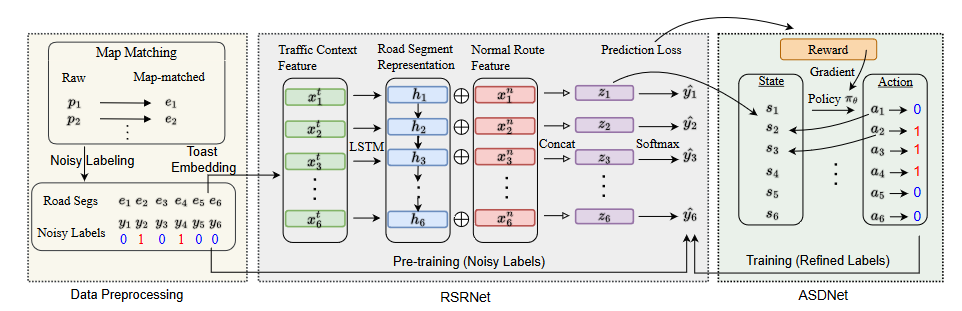 确定正在进行的轨迹的子轨迹是否异常是一个决策过程,可以建模为马尔可夫决策过程(MDP)。论文提出了一个名为RL4OASD的弱监督框架(见图2)。该框架由三个部分组成,即数据预处理、RSRNet和ASDNet。在数据预处理中,论文对原始轨迹进行地图匹配,将其映射到道路网络上并获得地图匹配的轨迹。基于地图匹配的轨迹,论文使用基于路段之间的历史过渡数据的一些启发式方法来计算轨迹中涉及的路段的一些标签。这些带有噪声的标签将用于以弱监督方式训练RSRNet。在RSRNet中,论文基于交通上下文特征和正常路线特征来学习路段的表示。这些向量形式的表示将被输入到ASDNet中,以定义用于标记异常子轨迹的MDP状态。在ASDNet中,论文将标记异常子轨迹的任务建模为MDP,并通过策略梯度方法学习策略。ASDNet输出细化的路段标签,进一步用于再次训练RSRNet,然后RSRNet为ASDNet提供更好的观察结果,以训练更好的策略。该过程进行迭代,论文将RSRNet和ASDNet组合而成的算法称为RL4OASD。2.2 数据预处理
