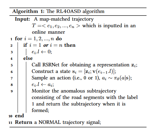 RL4OASD算法基于学习的策略来检测异常子轨迹。该过程如算法1所示。具体来说,RL4OASD以在线方式接受持续轨迹,将每个路段标记为正常(即0)或非正常(即1)(第 19行)。它首先根据定义将源路段或目标路段标记为正常路段(第2-3行)。然后,它通过调用RSRNet(第5-6行)构建一个状态,并根据ASDNet中学习到的策略对动作进行采样以标记路段(第7-8行)。它监视路段上涉及异常标签(即1)的异常子轨迹,并在其形成时将其返回(第9行)。最后,如果没有检测到异常,算法将返回正常轨迹标签(第11行)。论文进一步开发了两项增强功能来提高RL4OASD的有效性和效率。一种称为路网增强标签(RNEL),另一种称为延迟标签(DL)。