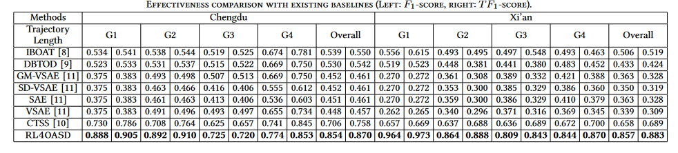路网增强标签。对于RNEL,论文利用道路网络的图结构来帮助标记路段,其中路段上的标签在以下三种情况之一是确定性的:(1)如果ei−1.out = 1,则 ei.in = 1,则 ei.l = ei−1.l。(2) 如果 ei−1.out = 1,ei.in > 1且ei−1.l = 0,则ei.l = 0。(3) 如果 ei−1.out >1,ei.in = 1,ei−1.l = 1,则ei.l = 1。这里,ei.out和ei.in分别表示路段ei的出度和入度,ei.l表示道路的标签段ei。它们背后的共同直觉是:(a)异常状态从ei−1处的正常(0)到ei处的异常(1)的任何变化都意味着存在从ei−1到其他路段的替代过渡(即,ei−1.out >1); (b) 异常状态从ei−1处的异常(1)到ei处的正常(0)的任何变化都意味着存在从其他路段到ei的替代过渡(即ei.in > 1)。根据规则,论文仅通过强化学习模型在其他情况下执行操作,因此可以避免一些潜在的错误决策。此外,由于通过检查规则而不是调用RL模型来节省某些情况下采取行动的时间,因此可以提高效率。 延迟标签。对于DL,只要识别出边界,RL4OASD就会形成一个异常子轨迹,即,如果ei−1.l = 1 且 ei.l = 0,则边界被识别在 ei−1 处。直观上,形成一个异常子轨迹看起来有点仓促。异常的子轨迹,可能会从目标轨迹中产生许多短碎片。因此,论文将延迟技术视为后处理步骤。具体来说,当形成异常子轨迹时,它会扫描ei−1之后的D个路段。在D条路段中,选择最终位置j(i−1<j≤ i−1+D),其中该路段的标签为1,然后将位置i−1和j之间的一些0转换为1。可以验证,延迟标记不会产生太多时间成本,并且提供了更好的连续性,避免形成太多碎片。时间复杂度。RL4OASD算法的时间复杂度为O(n),其中n表示目标轨迹的长度。时间由两个网络主导,即RSRNet和ASDNet。在RSRNet中,一段路段的时间成本包括(a)获取TC和NRF嵌入的时间成本,均为O(1)。(b)通过经典LSTM单元获取z的时间成本,即 O(1)。在ASDNet中,一条路段的时间成本包括(a)构建状态的时间成本,其中z部分已在 RSRNet中计算,v(e.l)部分通过嵌入层获得,其复杂度为O(1)。(b)通过学习的策略对动作进行采样,其时间复杂度为O(1)。正如在算法中看到的,两个网络最多被调用n次。因此,RL4OASD的时间复杂度为O(n) × O(1) = O(n)。对于轨迹或子轨迹异常检测任务,O(n)时间复杂度保持了现有算法当前最好的时间复杂度,并且可以很大程度上满足在线场景的实际需求正如论文的实验所示。数据集:实验在滴滴出行的两个真实世界出租车轨迹数据集(成都和西安)上进行。所有原始轨迹都通过流行的地图匹配算法预处理为地图匹配轨迹,两个城市的道路网络从OpenStreetMap获得。根据之前的研究,论文对数据集进行预处理并过滤那些包含少于25条轨迹SD对,以获得足够的轨迹来指示正常路线。论文从数据集中随机抽取10,000个轨迹进行训练,其余的进行测试。基线:实验将IBOAT、DBTOD、GM-VSAE、SDVSAE、SAE、VSAE和CTSS这七种方法作为基线方法进行比较。参数设置:在RSRNet中,林伟将TCF和NRF特征嵌入到128维向量中,并使用具有128个隐藏单元的LSTM来实现RSRNet。参数α、δ和D分别设置为0.5、0.4和8。为了训练RSRNet,通过实证研究以一小时的粒度计算24个时隙中的噪声标签。在ASDNet中,标签向量v(ei.l)的维度为128。策略网络采用单层前馈神经网络实现,并采softmax函数作为激活函数。根据实证结果,RSRNet和ASDNet的学习率分别设置为0.01和0.001。评估指标:为了验证子轨迹检测的结果,论文考虑两个评估指标F1-score与F1-score的变体T-F1-score。论文使用标记数据集研究异常子轨迹检测。表1报告了不同轨迹长度的有效性,例如,手动将成都数据集分为四组,即G1、G2、G3和G4,使得组中的长度为G1 < 15、15 ≤ G2 < 30、30 ≤ G3 < 45 和 G4 ≥ 45。论文还报告了整个数据集的整体有效性。结果清楚地表明,RL4OASD在不同设置方面始终优于基线。具体来说,就成都(分别是西安)的F1-score分数和T-F1score而言,它比最佳基线(即CTSS)高出约20%和15%(分别为30%和 28%)的整体效果,西安(成都)数据集上F1-score和T-F1-score分别提高约5%-26% 和1%-19%(分别为26%-47%和22%-45%)。一个可能的原因是CTSS需要一个阈值来提取那些异常分数大于阈值的异常部分。然而,很难针对所有复杂的流量情况适当地设置阈值。RL4OASD展示了其优越性,这主要是由于其对于异常子轨迹检测任务的数据驱动性质。此外,论文观察到RL4OASD在F1-score和T-F1-score方面表现出相似的结果趋势,这表明了方法的通用性。表1 与现有基线的有效性比较(左:F1-分数,右:T F1-分数)