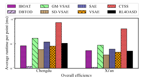 图3报告了成都和西安数据集上每个点平均运行时间的在线检测效率。可以观察到成都的运行时间比西安长,因为西安的轨迹普遍较短。还观察到DBTOD在两个数据集上运行速度最快,因为它是一个轻模型,具有一些更便宜的特征(例如用于检测的道路水平和转向角度)的低维嵌入,可以非常快速地完成,而RL4OASD涉及更多操作,包括基于LSTM的RSRNet来捕获特征,以及基于RL的ASDNet来标记每个路段。CTSS运行速度最慢,因为其涉及离散Frechet距离来计算目标轨迹与给定参考轨迹之间的偏差,其时间复杂度为二次方。此外,对于通过生成方案提出的用于轨迹检测的四种基于学习的方法GM-VSAE、SD-VSAE、SAE和VSAE,可以观察到SD-VSAE和VSAE通常比其他方法更快(即GM-VSAE和SAE)。这是因为SAE是用传统的Seq2Seq结构提出的,其中涉及到编码和解码的操作,需要扫描轨迹两次。与SAE相比,VSAE没有编码步骤,只涉及解码步骤来检测一些可能的异常。对于SD-VSAE,它是GM-VSAE的快速版本,它仅使用其SD模块在编码(或推理)步骤中预测一个高斯分量;然而,GM-VSAE在编码步骤中需要多个组件,并使用所有这些组件来检测解码中的异常。总体而言,RL4OASD的运行速度相当快,能够满足实际需求,例如处理每个点的时间不到0.1ms,比轨迹数据的实际采样率(2s)快了20,000倍。