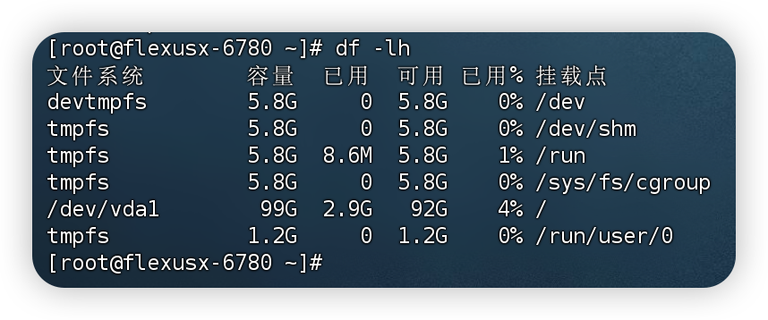 - devtmpfs:设备虚拟文件系统,总空间为 5.8 G。 - tmpfs(挂载在 /dev/shm):另一个临时文件系统,总空间为 5.8 G。 - tmpfs(挂载在 /run):临时文件系统,总空间为 5.8 G。 - tmpfs(挂载在 /sys/fs/cgroup):临时文件系统,总空间为 5.8 G。 - /dev/vda 1:主存储分区,总空间为 99 G,已使用 2.9 G,可用 92 G(已用 4%)。这是挂载在 / 的根文件系统。 - tmpfs(挂载在 /run/user/0):临时文件系统,总空间为 1.2 G。