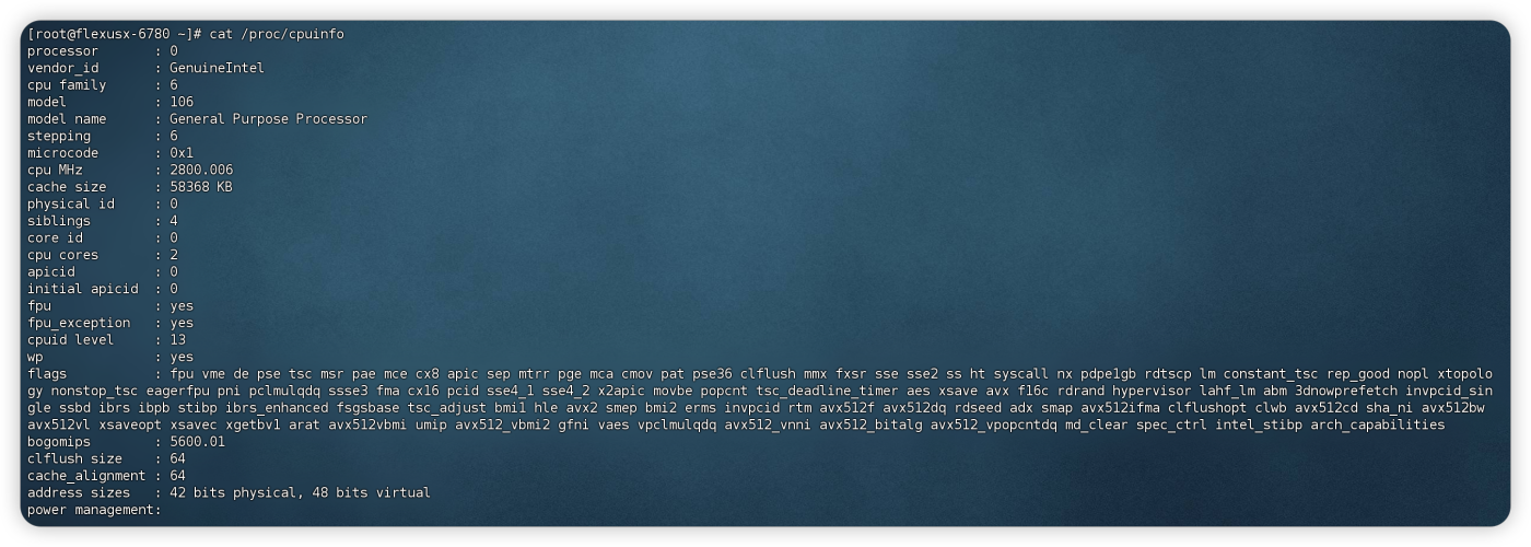 - Processor:表示处理器的编号。对于多核或多处理器系统,可以看到多个处理器的编号(从 0 开始),可以从最大值确认系统中有多少个逻辑处理器(CPU Core + Hyper-Threading)。这里表示第 0 个处理器 - Vendor ID:处理器制造商的标识。Flexus X 实例采用的是一个由 Intel 制造的 CPU。 - CPU Family、Model 和 Stepping:这些字段标识处理器的特定家族、型号和步进版本。通过这些信息,可以进一步确认处理器的架构、制造工艺等。 - Model Name:处理器的具体型号,这包括处理器系列、核心数量、主频等关键信息。这里显示是通用处理器,可能是使用了虚拟化技术。 - CPU MHz:当前处理器的运行频率(单位为 MHz)。这是实际的时钟速度,可能随着 CPU 的负载情况而变化,尤其在支持动态频率调节(如 Intel 的 Turbo Boost)时。这是一个动态值,当前是 2.8 GHz。 - Cache Size:CPU 缓存的大小。缓存大小影响 CPU 处理数据的效率,大缓存通常意味着更好的性能,尤其是在处理频繁访问的数据时。这显示了 CPU 的三级缓存大小为 58 MB,可以看到是一个较大的缓存。 - Physical ID 和 Core ID:Physical ID 标识物理 CPU 的编号,Core ID 标识该物理 CPU 上的某个核心。 - Siblings 和 CPU Cores:Siblings 表示一个物理处理器上总共可见的逻辑处理器数量(包括超线程在内),而 CPU Cores 则表示物理核心数量。通过这些信息可以确定是否启用了超线程(Hyper-Threading)技术。Siblings 为 4,表示 4 个逻辑处理器,启用了超线程技术。并且该物理处理器具有 2 个物理核心。 - Flags:CPU 支持的功能和指令集(例如 lm 表示 64 位支持,sse4_2 表示支持 SSE 4.2 指令集)。这些标志位可以反映出 CPU 的功能特性,比如是否支持虚拟化(如 vmx 表示 Intel VT-x 支持),或者是否支持高级加密标准(如 aes)。